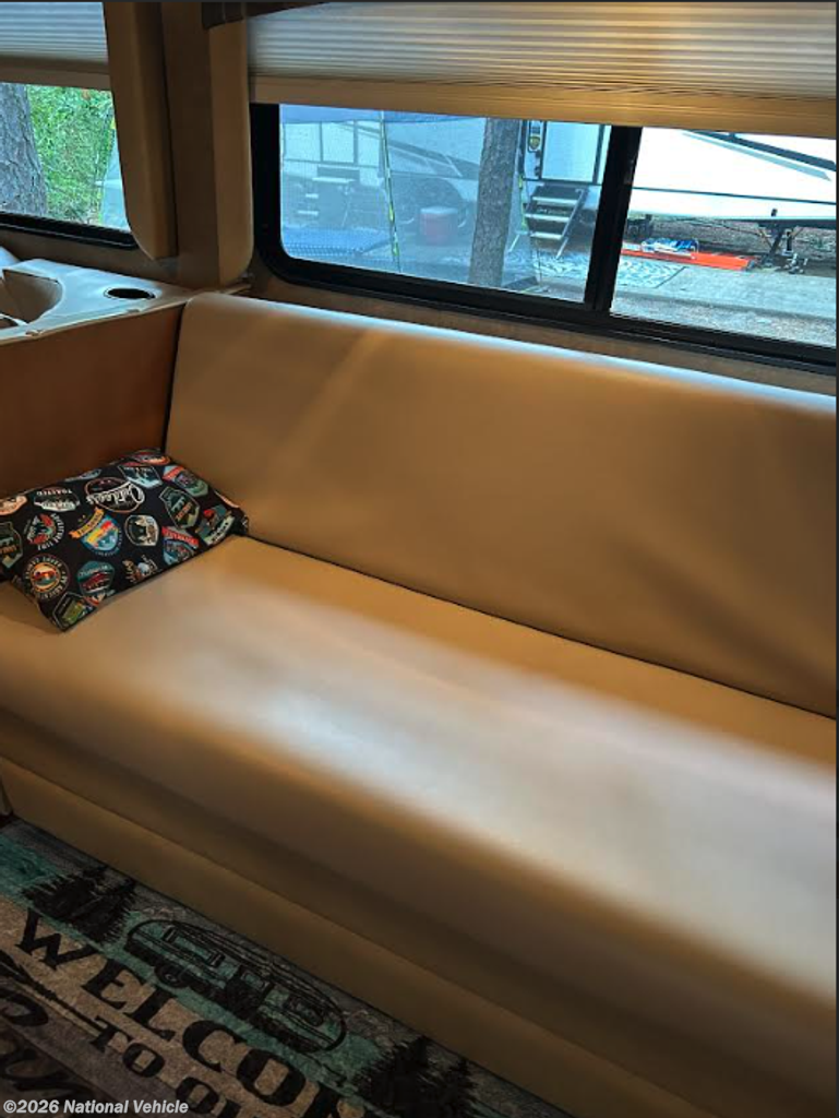 Inside, the Freelander 31DS features a well-thought-out double slide floorplan that creates an open, residential-style layout. The front living area offers a large U-shaped dinette and a sofa sleeper, both perfect for dining, relaxing, or accommodating extra guests. Overhead, a cab-over bunk provides additional sleeping space, making this coach capable of sleeping up to 8. The kitchen is fully equipped with a three-burner range, oven, microwave, refrigerator, and ample cabinetry for extended stays on the road.