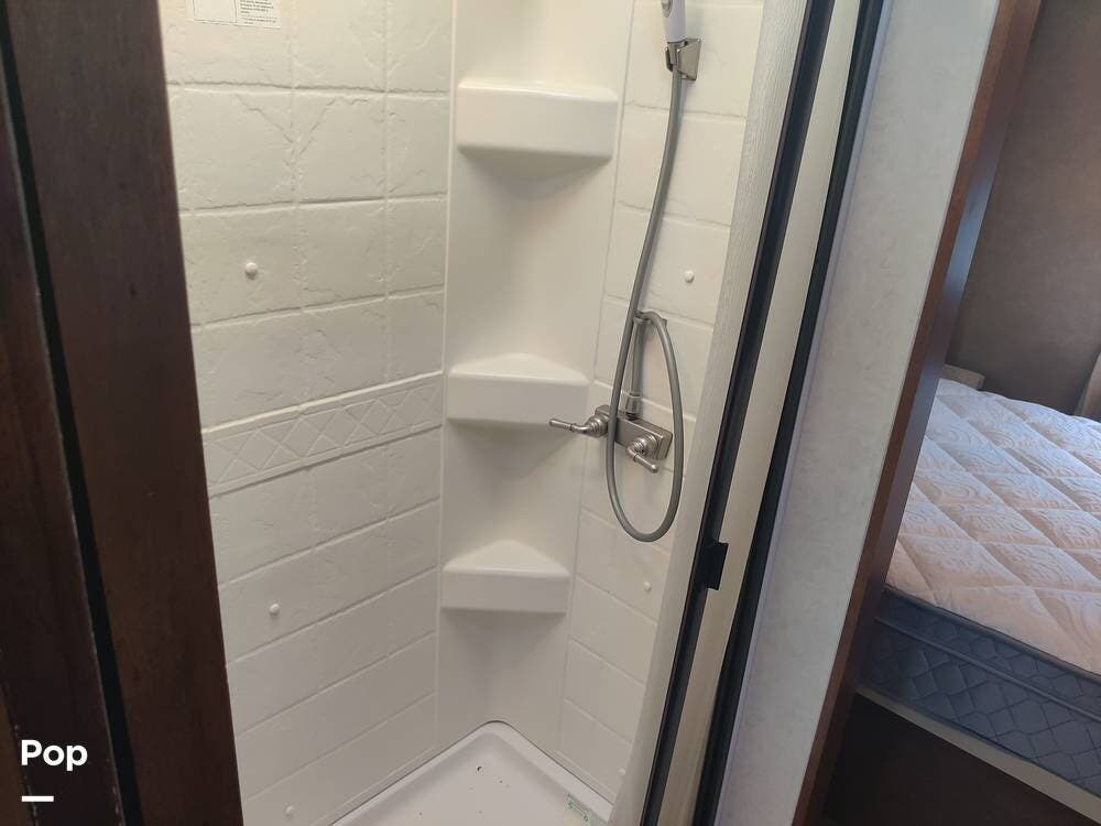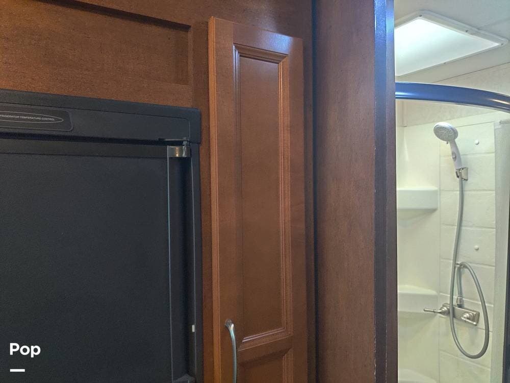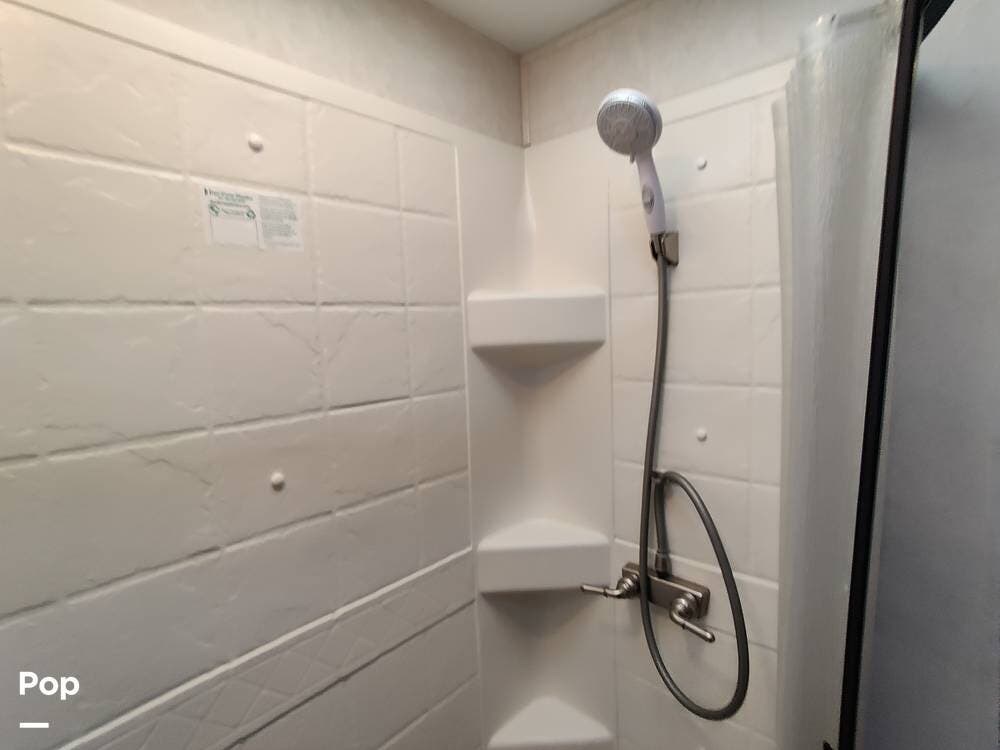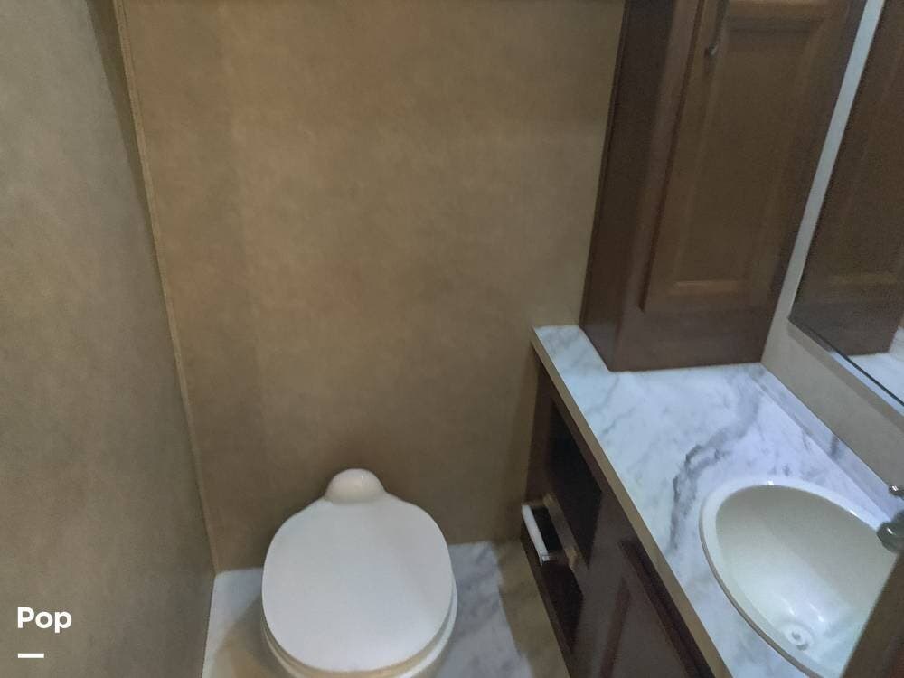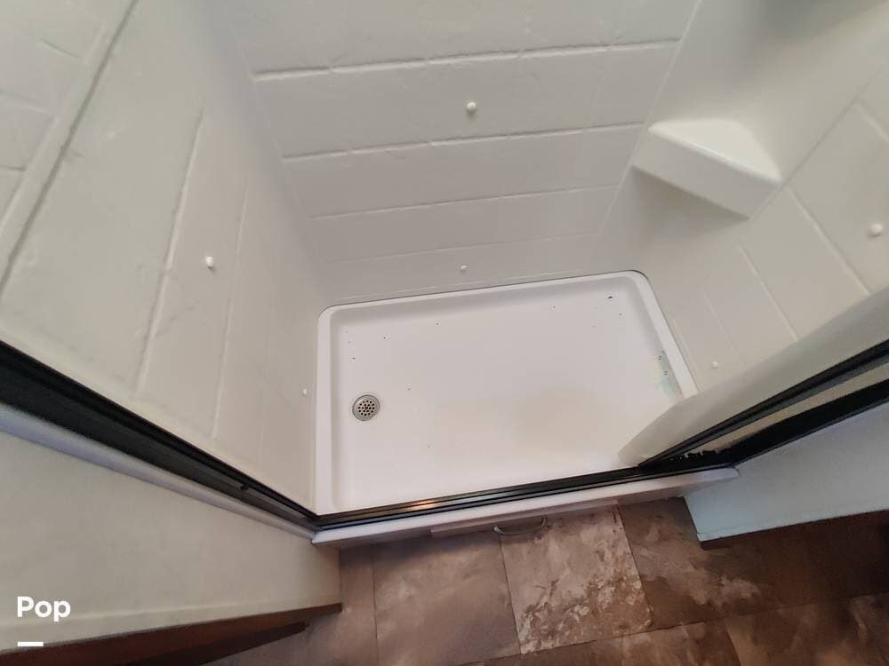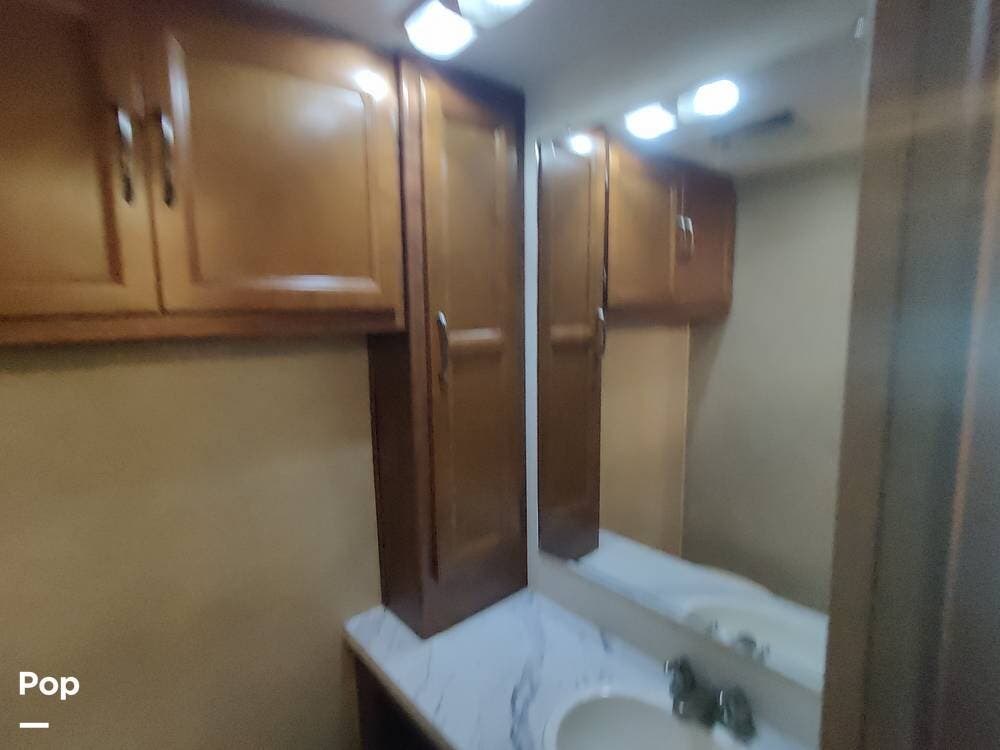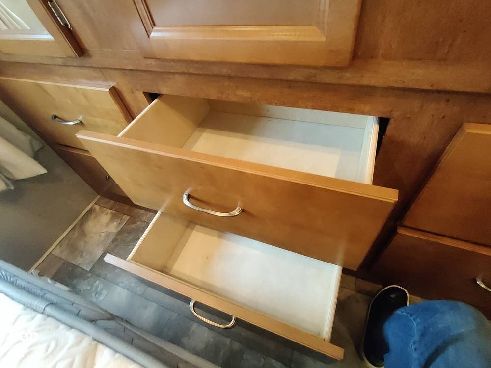 The mid bath has a shower opposite it, and it is accompanied by a toilet. This arrangement separates the living area from the owner's suite, providing some privacy. The driver's side has a slide-out behind it for extra living space.