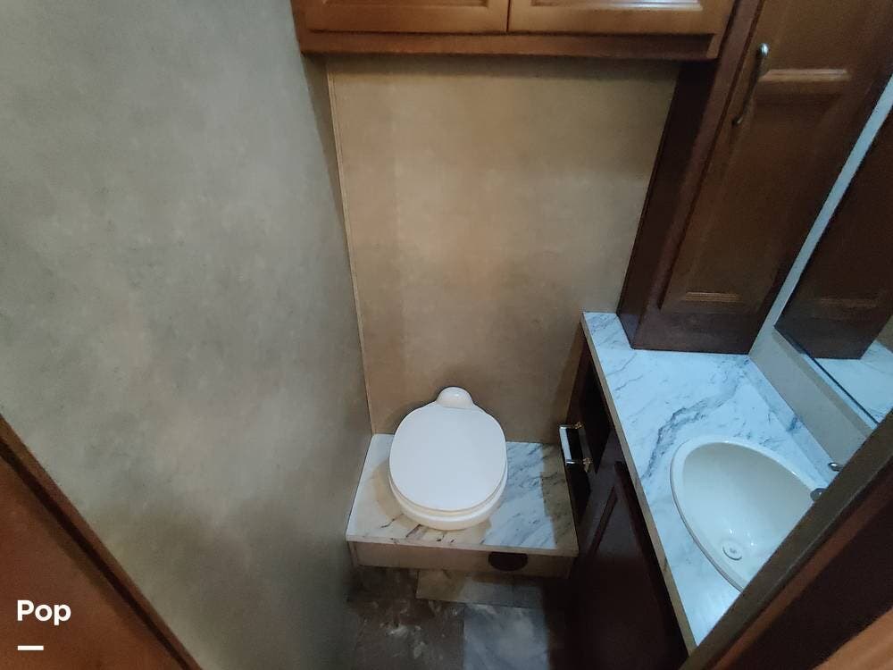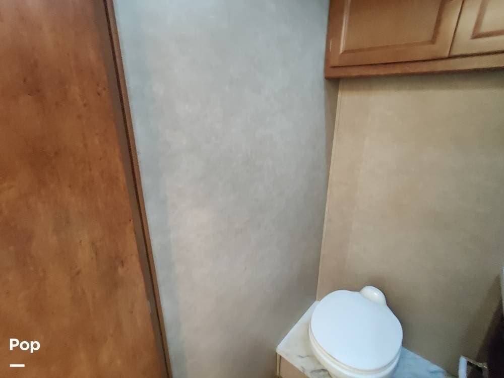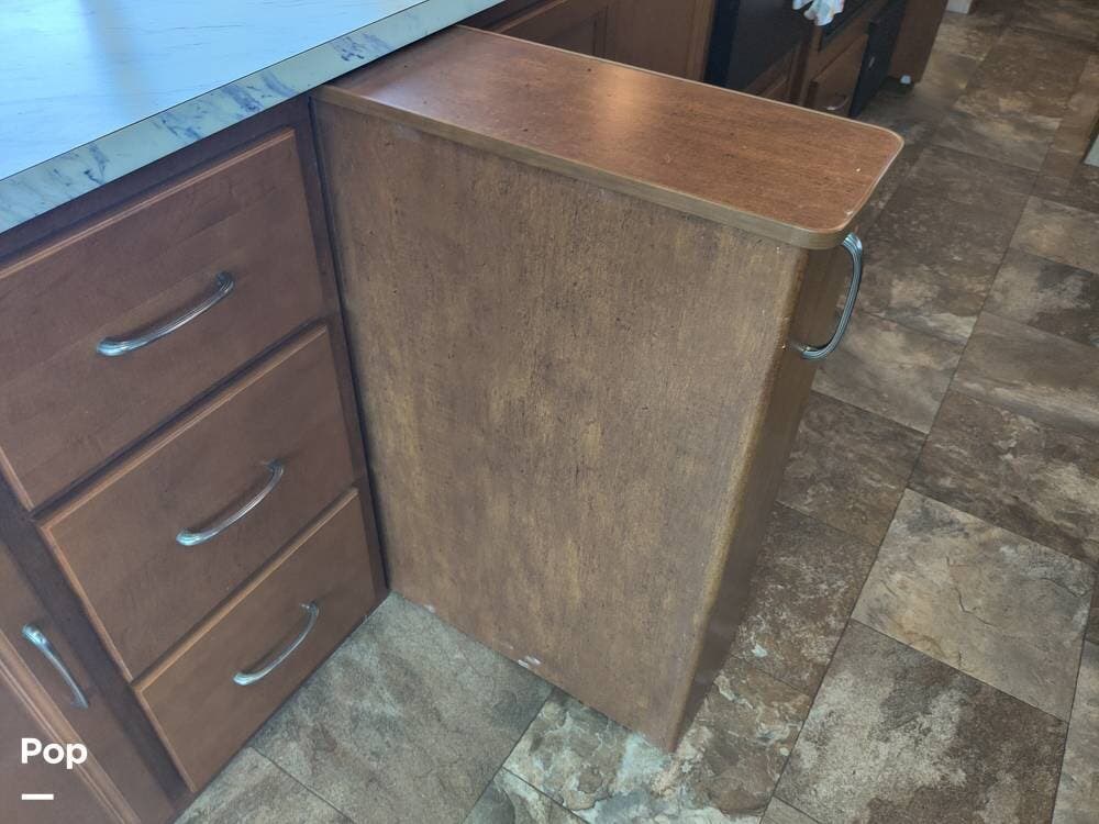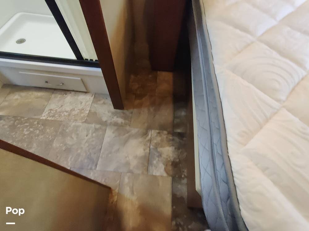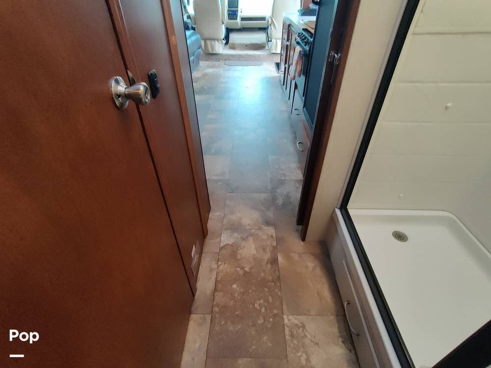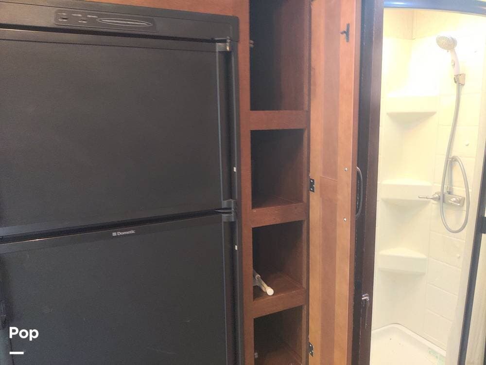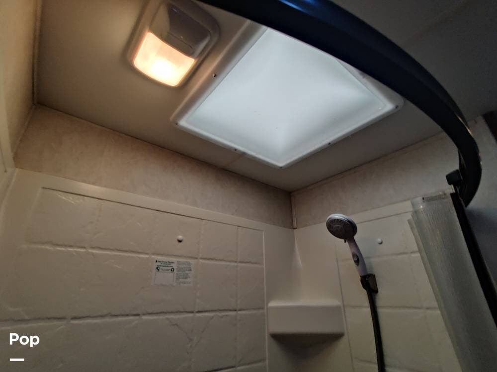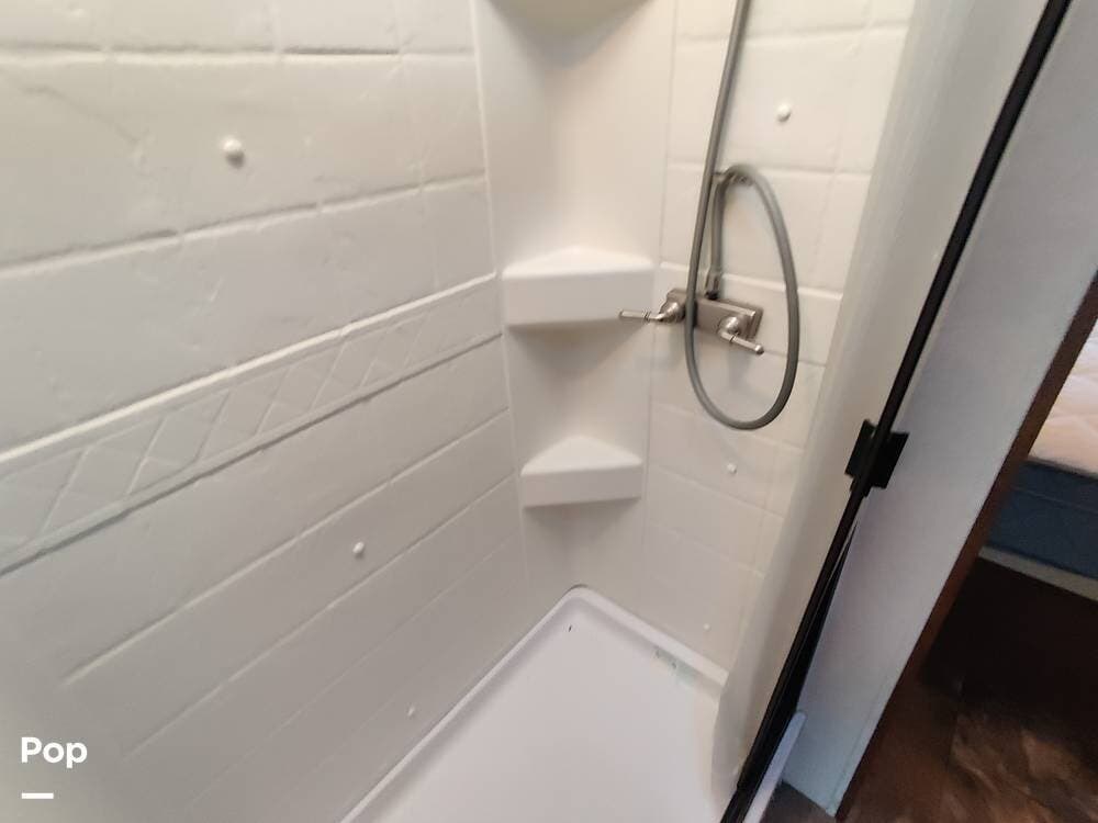 The mid bath has a shower opposite it, and it is accompanied by a toilet. This arrangement separates the living area from the owner's suite, providing some privacy. The driver's side has a slide-out behind it for extra living space.