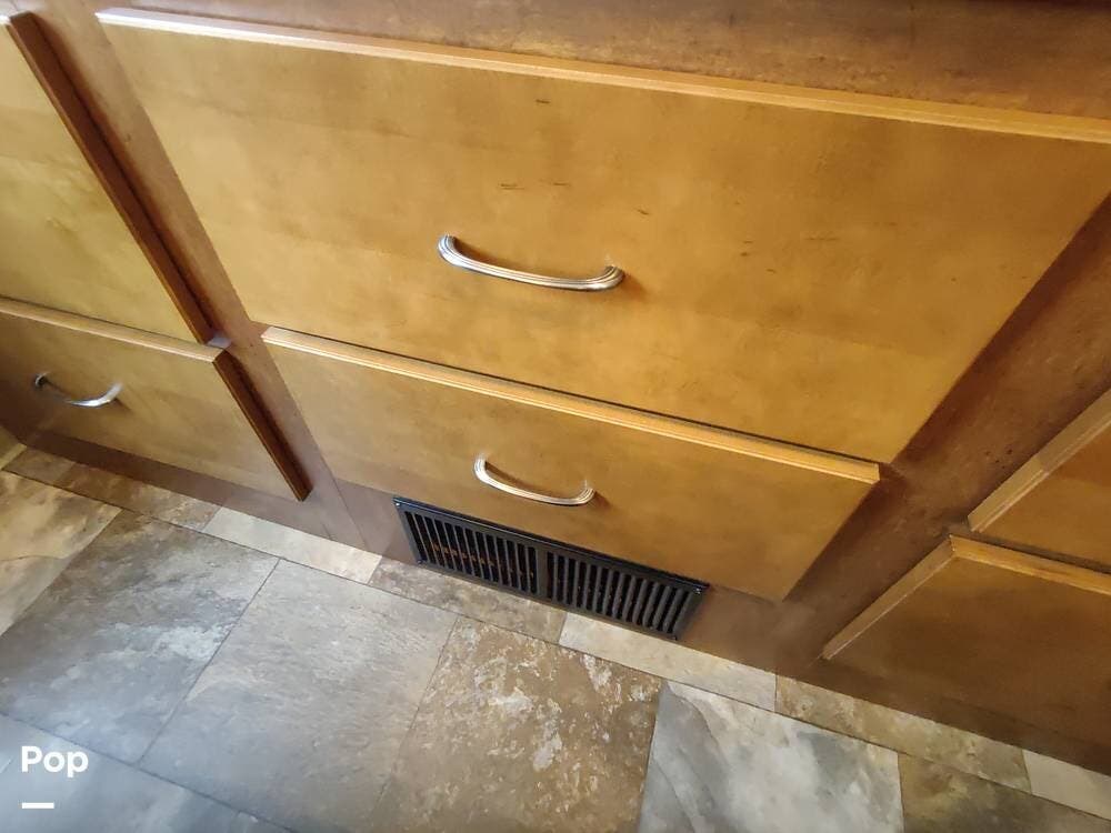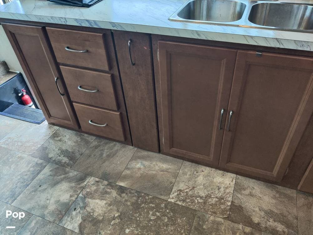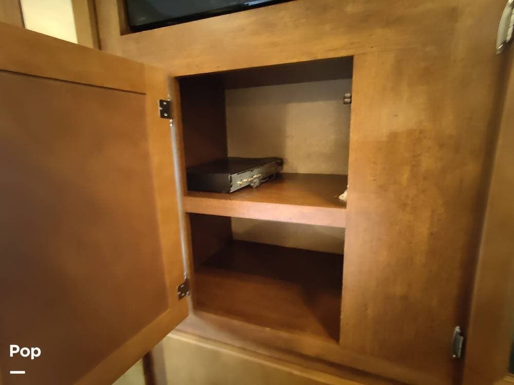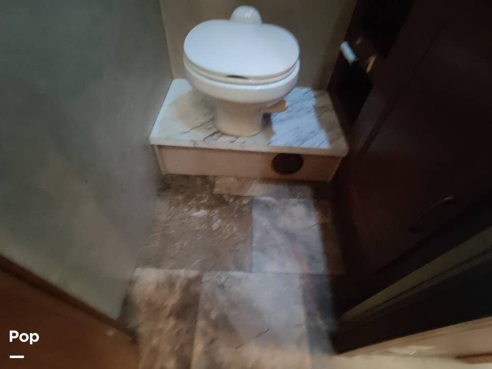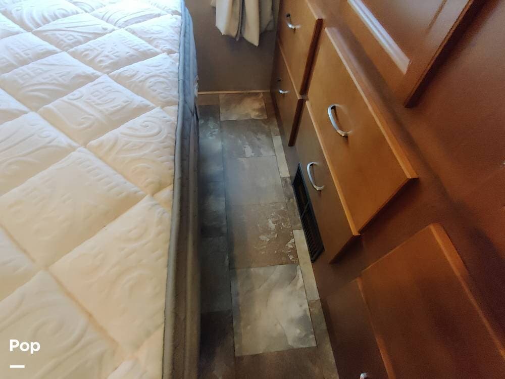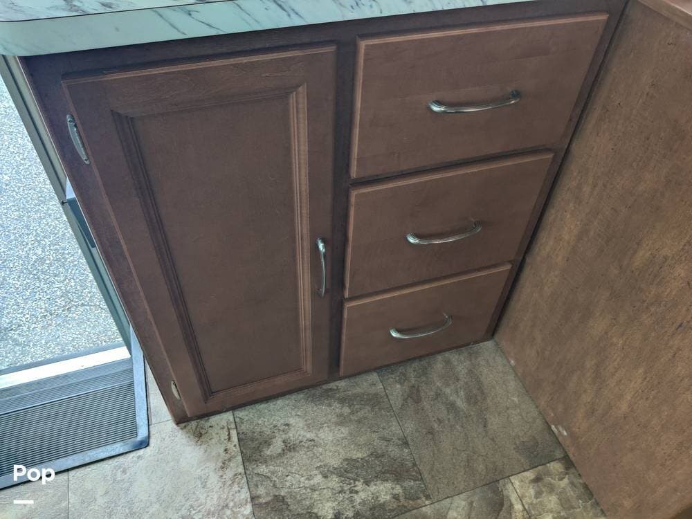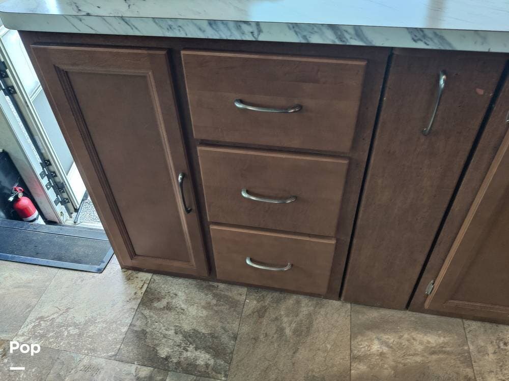The mid bath has a shower opposite it, and it is accompanied by a toilet. This arrangement separates the living area from the owner's suite, providing some privacy. The driver's side has a slide-out behind it for extra living space.