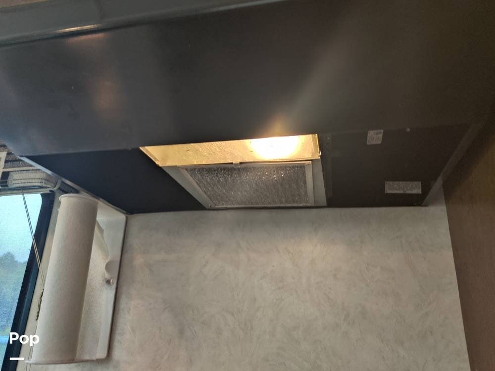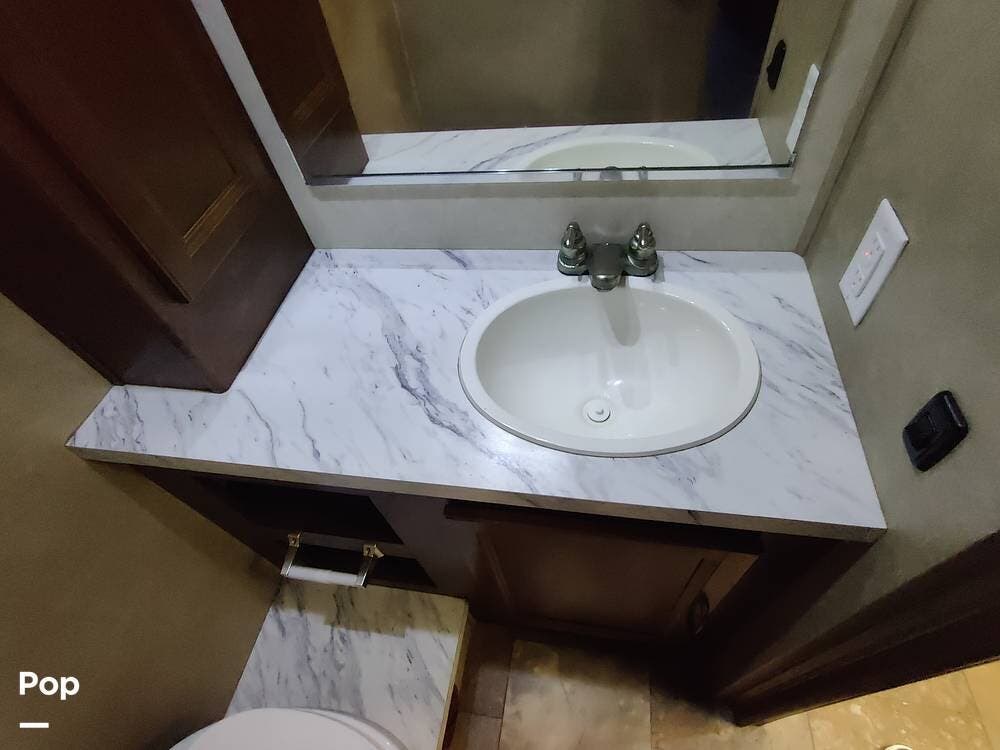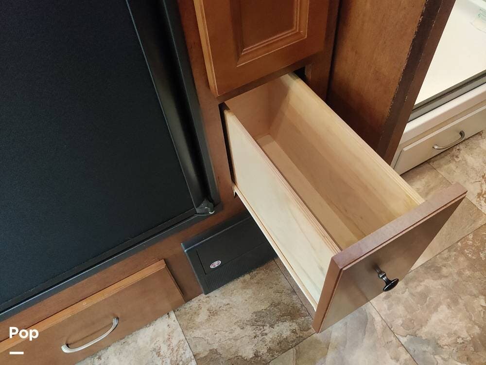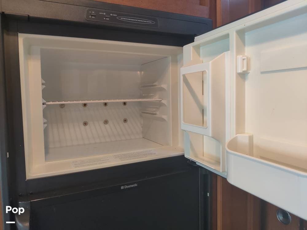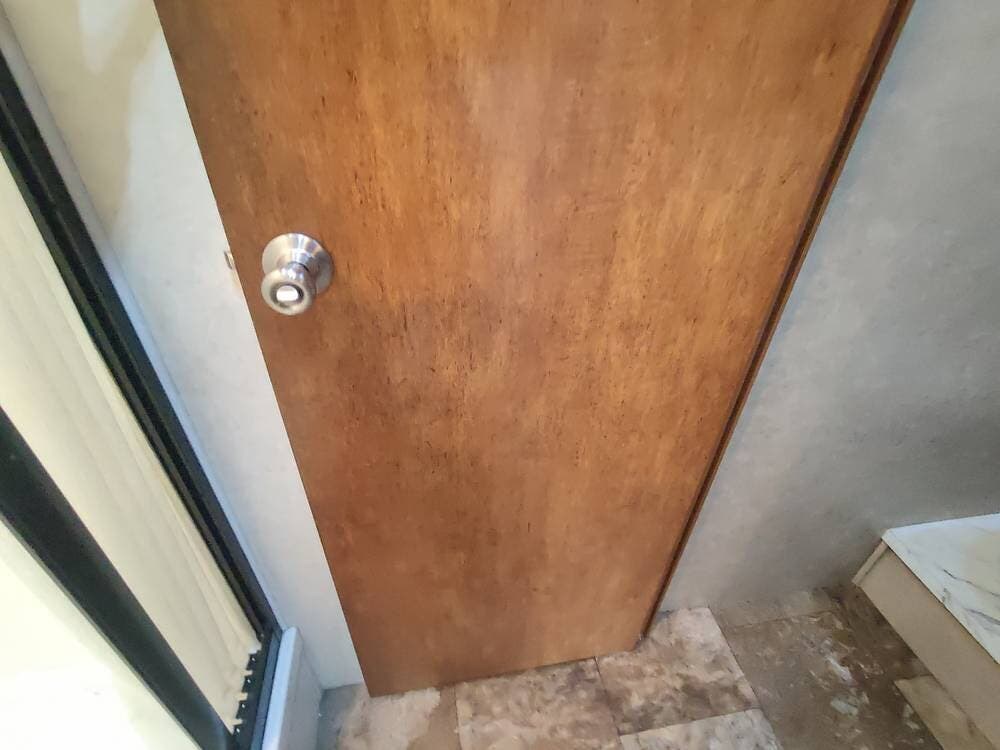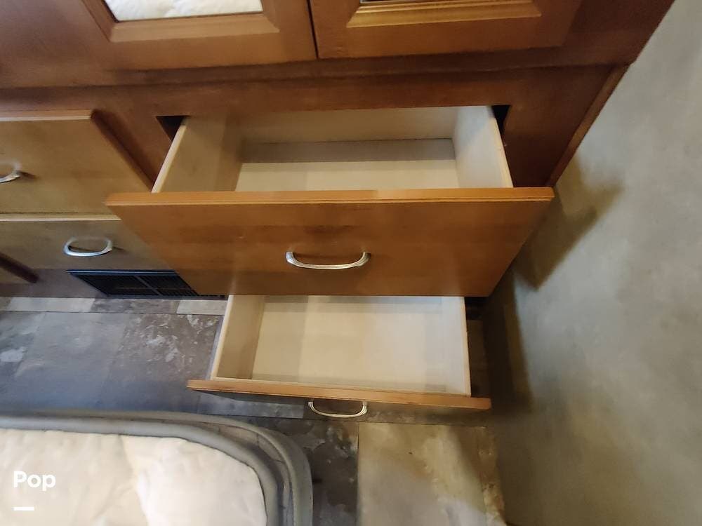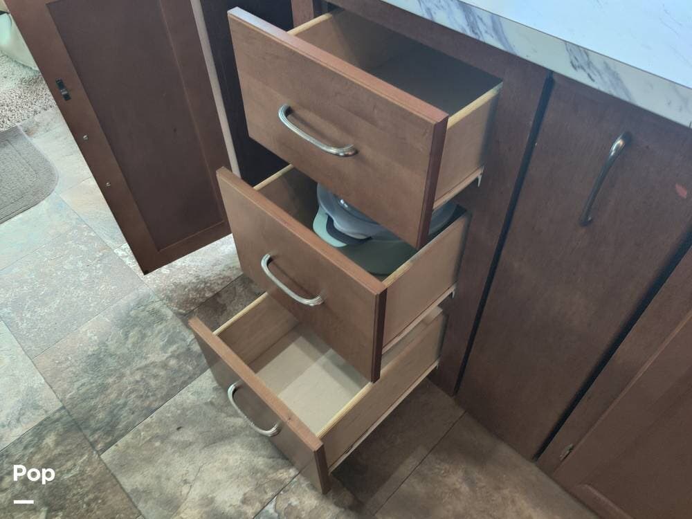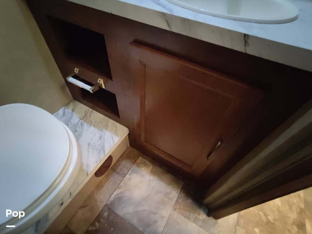 The mid bath has a shower opposite it, and it is accompanied by a toilet. This arrangement separates the living area from the owner's suite, providing some privacy. The driver's side has a slide-out behind it for extra living space.