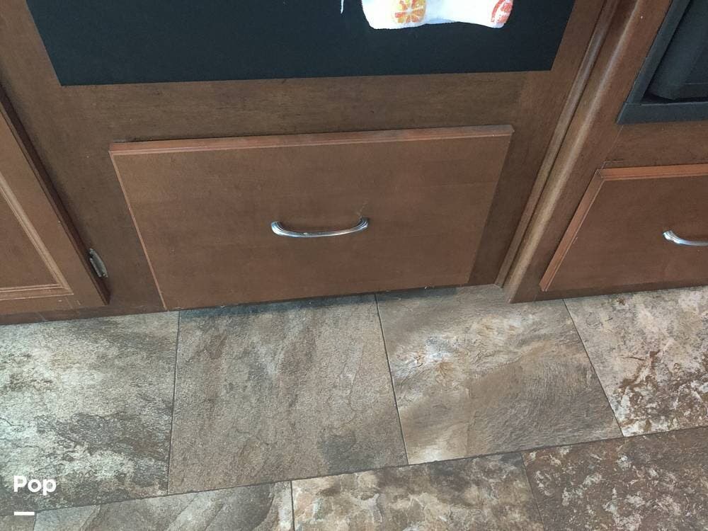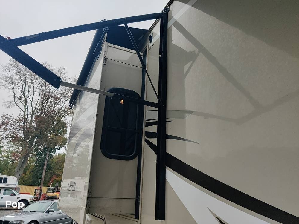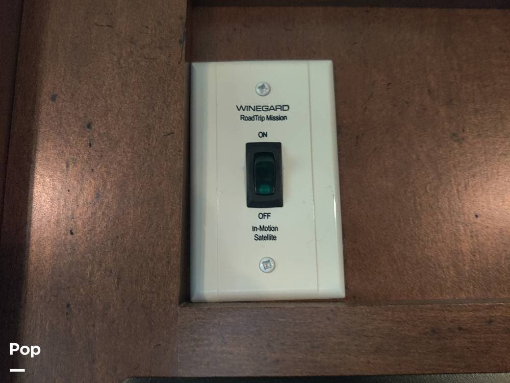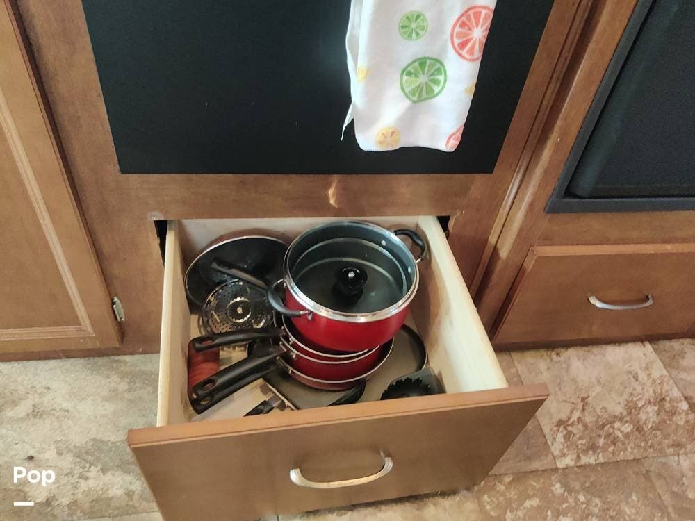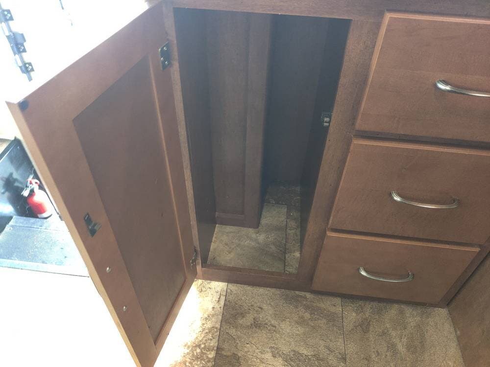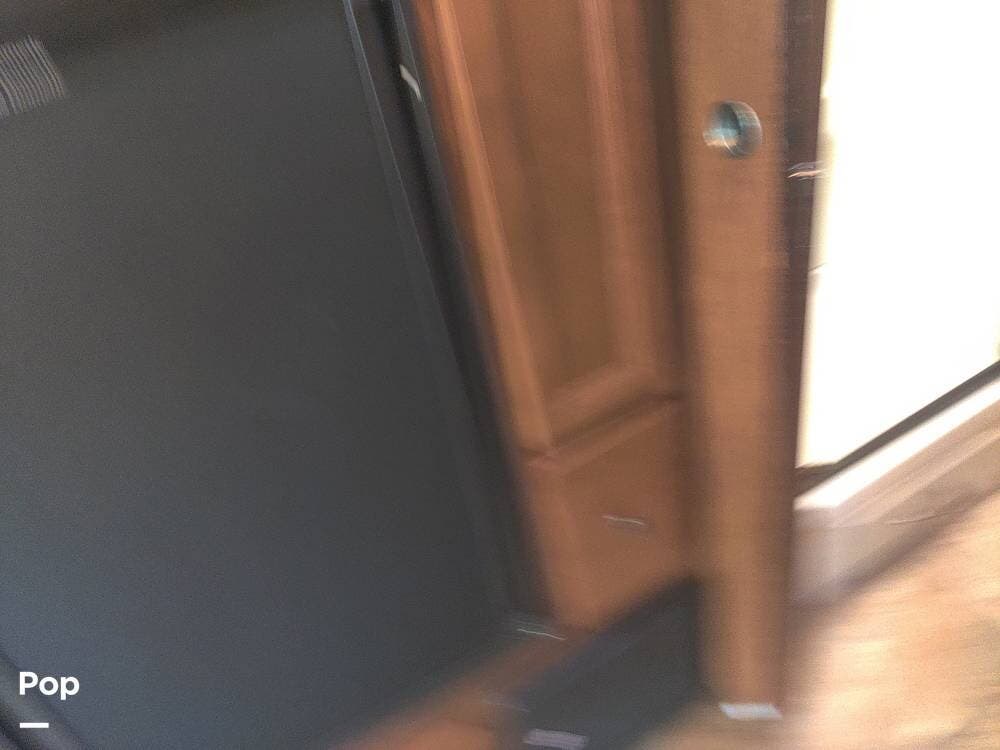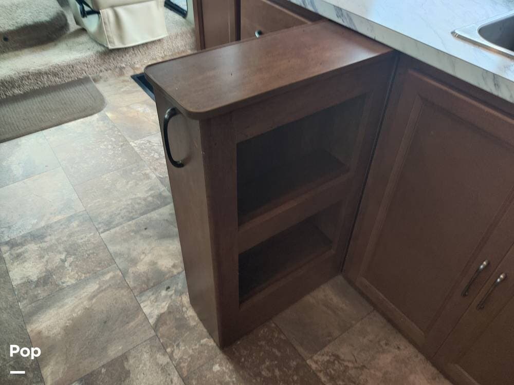 The mid bath has a shower opposite it, and it is accompanied by a toilet. This arrangement separates the living area from the owner's suite, providing some privacy. The driver's side has a slide-out behind it for extra living space.