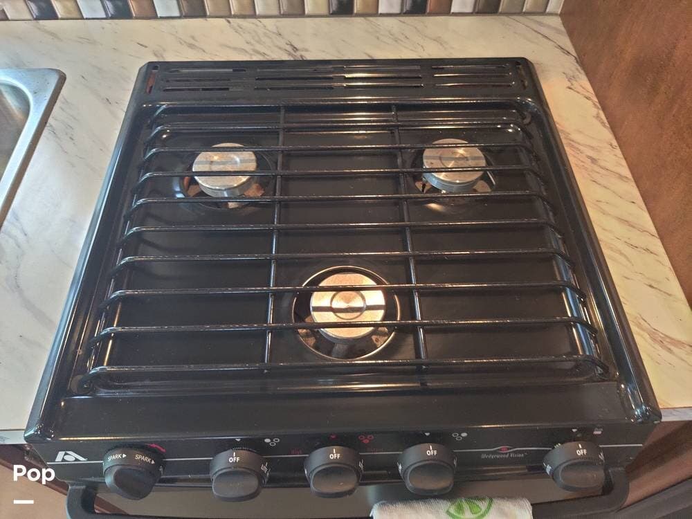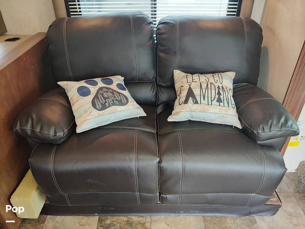 This unit accommodates up to six guests, featuring a queen bed in the private quarters, a drop-down bunk over the cab, a convertible dinette sleeper, and a dual recliner sofa.