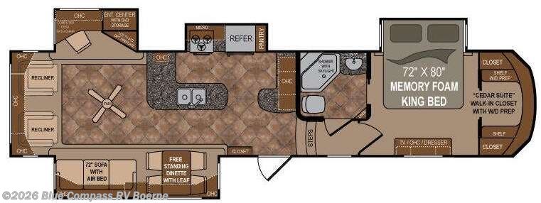 Infinity Fifth Wheel by Dutchmen w/Rear Living Area Including 2 Recliners, End Table, Overhead Storage, Ceiling Fan, 72" Sofa w/Air Bed & Free Standing Dinette Slideout, Computer Desk w/Chair & Overhead Cabinet & Ent. Center w/DVD Storage Slide, L-Shaped Counter w/Dbl. Kitchen Sink, 3 Burner Range/Refrig. & Pantry Slide, Counter w/Overhead Storage, Entry Closet, Step Up to Side Aisle Bath w/Angle Shower, Toilet & Sink, Dresser, Front King Memory Foam Bed Slide, Walk-In Cedar Closet & Much More!