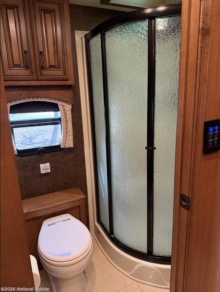 Mid-coach, the spacious bathroom features a large shower, elegant vanity, and upscale fixtures. Toward the rear, the private master suite offers a king bed, generous wardrobe space, and a Splendide stackable washer and dryer?bringing true residential comfort on the road.