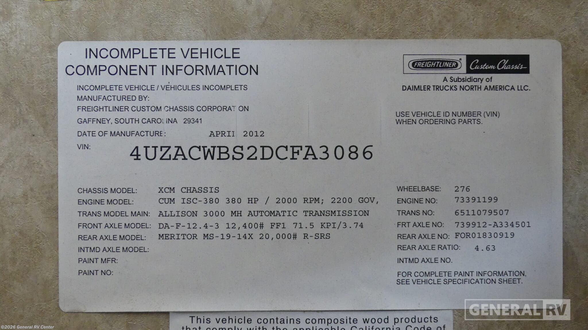 - VIN4UZACWBS2DCFA3086