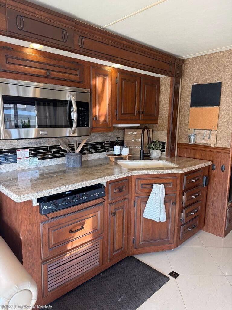 Inside, the Berkshire 390BH features a well-thought-out floorplan that caters to both comfort and convenience. A private rear bedroom offers a peaceful retreat, while the mid-coach bunkhouse adds flexibility for family or guests. The front living area includes plush seating, a large dinette, and a full kitchen outfitted with solid-surface countertops, high-end cabinetry, and modern appliances?making it easy to enjoy home-cooked meals on the road.