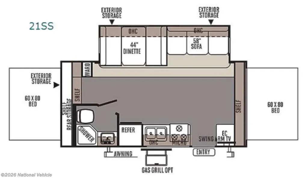 The 21SS remains one of the most sought-after hybrid floorplans because of its balance of space, weight, and functionality.