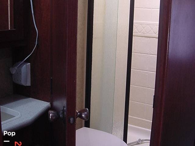 The rear bathroom has a shower and commode behind the door, with a sink and medicine cabinet that are always accessible.