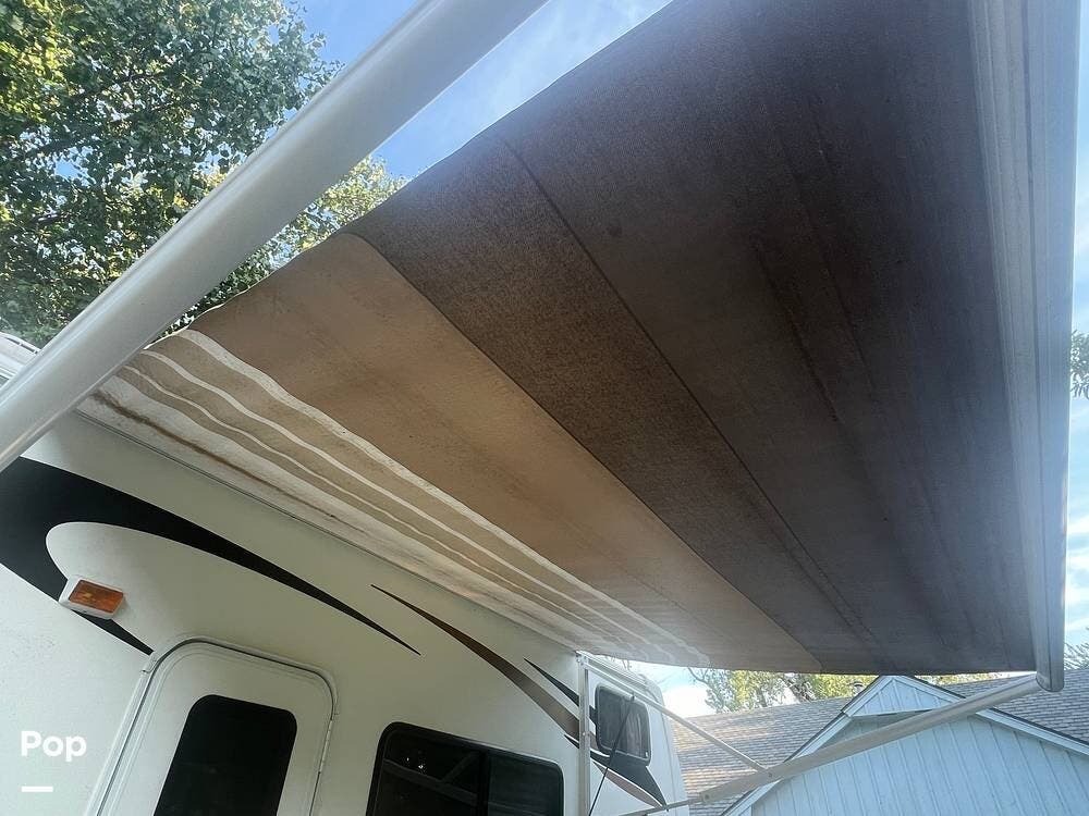 The exterior includes a large awning and additional storage compartments, rounding out the RV's features for comfortable and enjoyable travel.