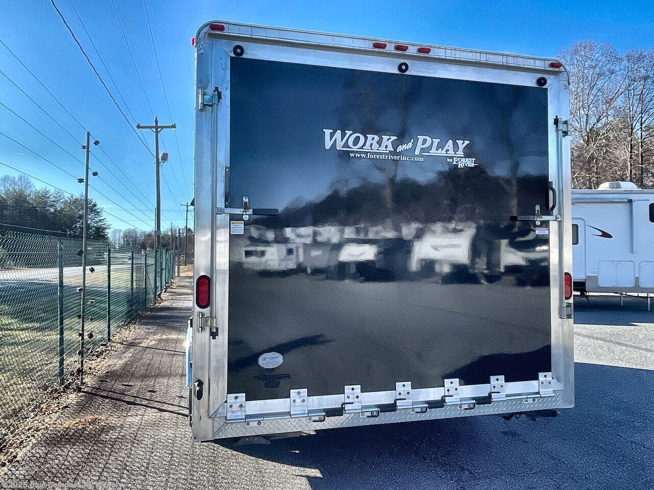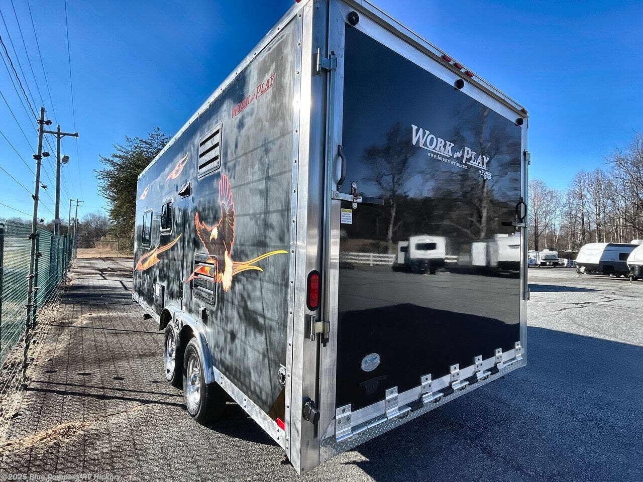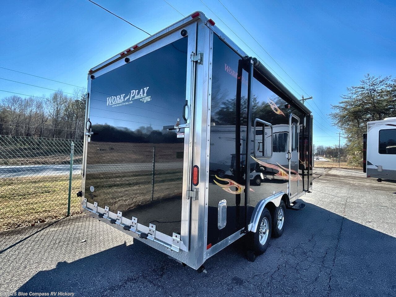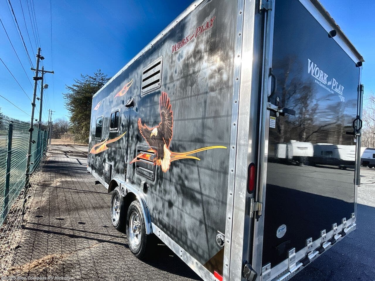 Work and Play Toy Hauler Travel Trailer, Rear Flip Up Dinette, Refrigerator, 3-Burner Range, Double Kitchen Sink, Lav., Toilet, Shower, Murphy Bed, Sofa & Much More.