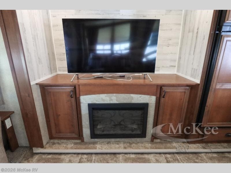 Rear Living Layout – Enjoy a spacious lounge featuring opposing slides, large picture windows, cozy seating, and a built-in entertainment center.