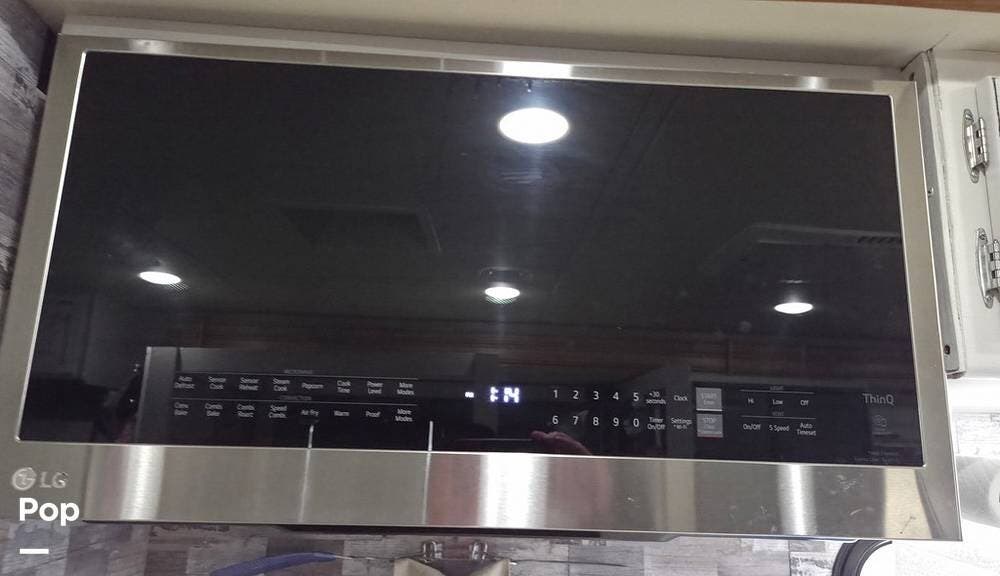 The kitchen is thoughtfully designed with solid-surface countertops, a 3-burner cooktop, convection microwave, and a full-size refrigerator, making meal preparation simple whether you're on the road or parked at your favorite destination.