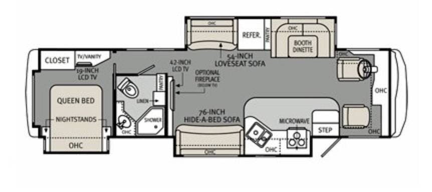Inside, the three slide-outs create a spacious living area that's perfect for relaxing or entertaining. Comfortable seating, large LCD televisions, and elegant cabinetry give the coach a true residential feel while providing plenty of room for family and guests.