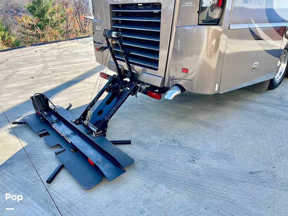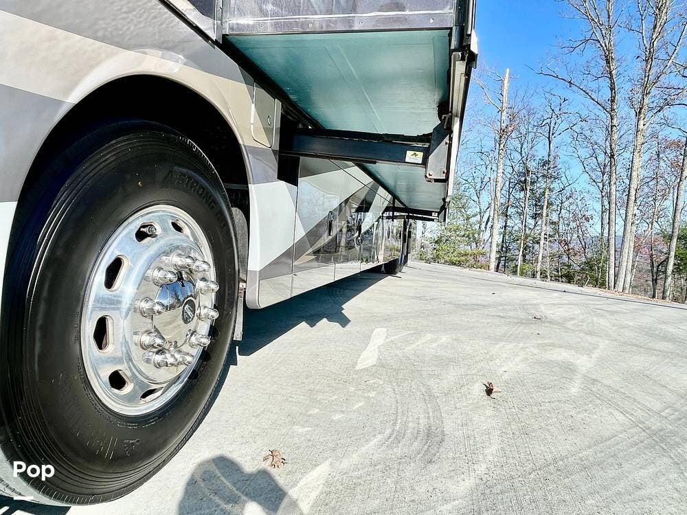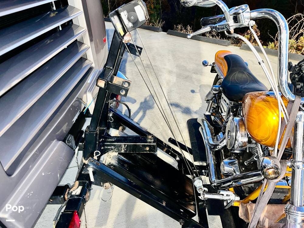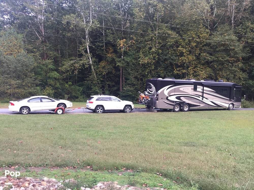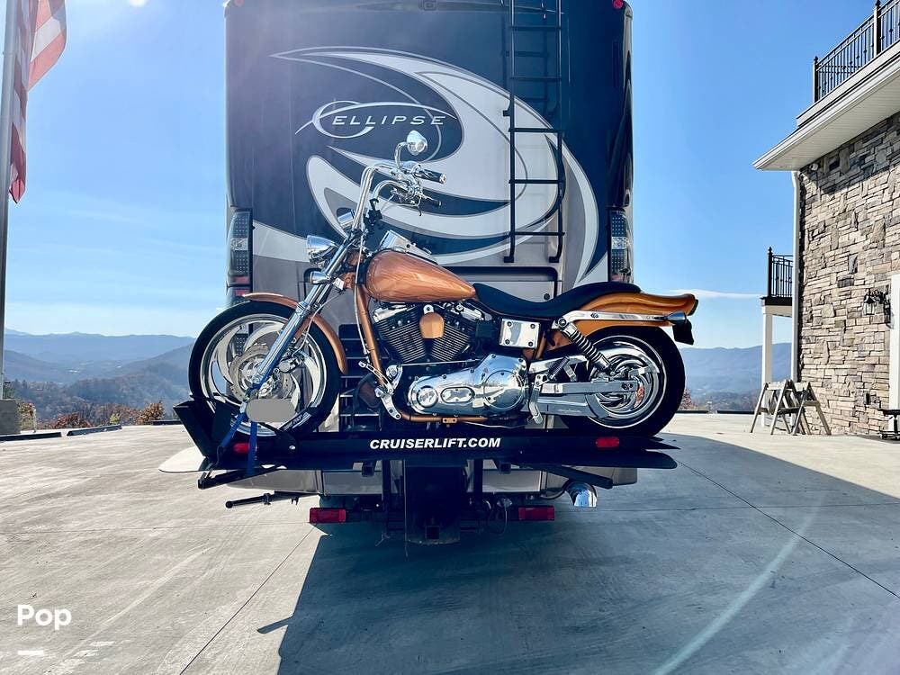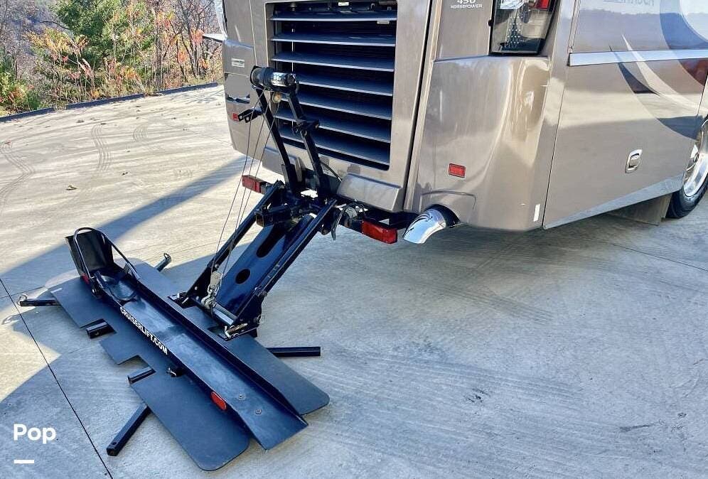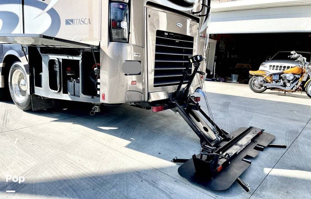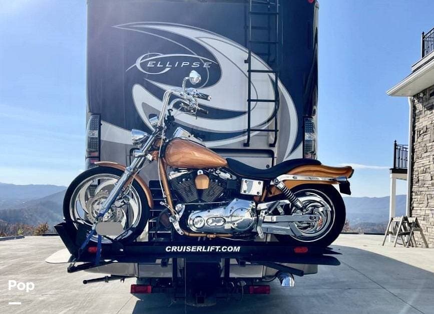 There are three slides, one of which is a full-wall slide, protective slide awnings, an exterior shower, and a roof access ladder. A Cruiserlift motorcycle transporter with a 15,000-lb towing capacity is mounted on the rear.