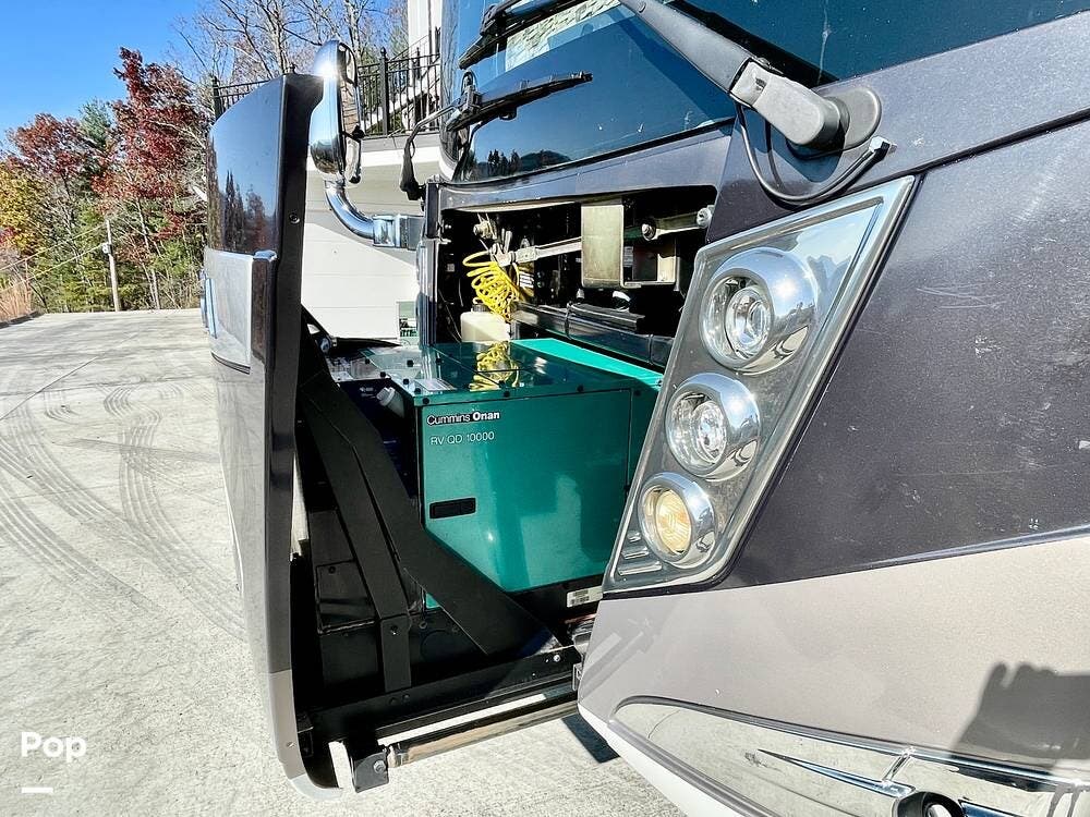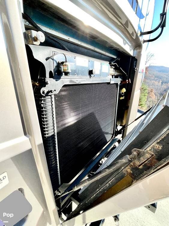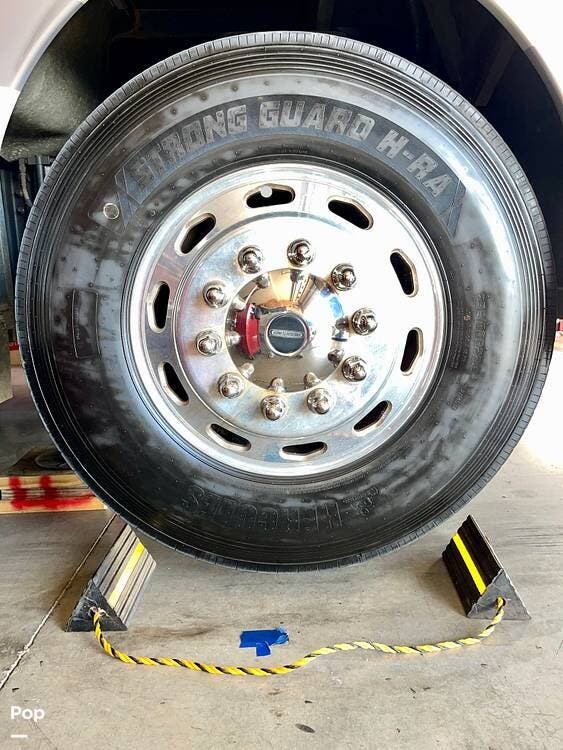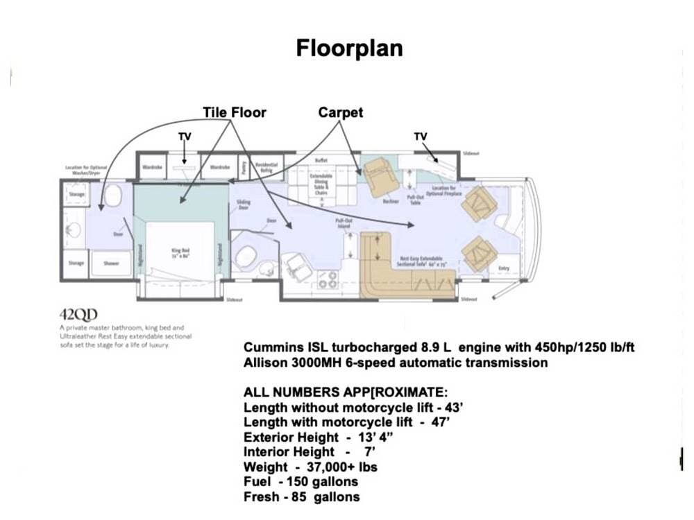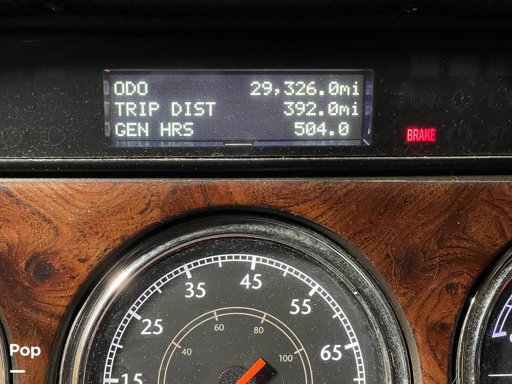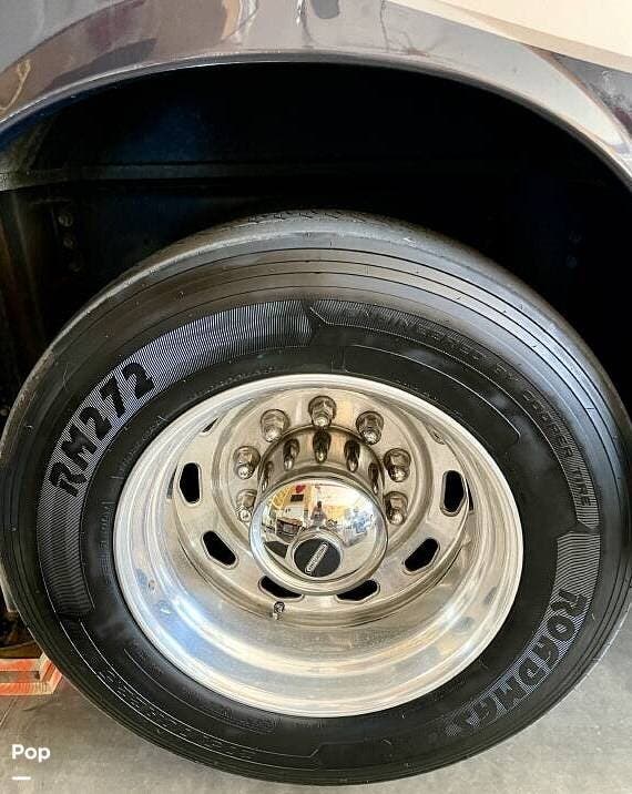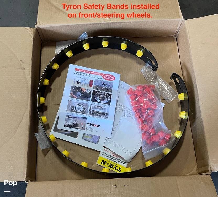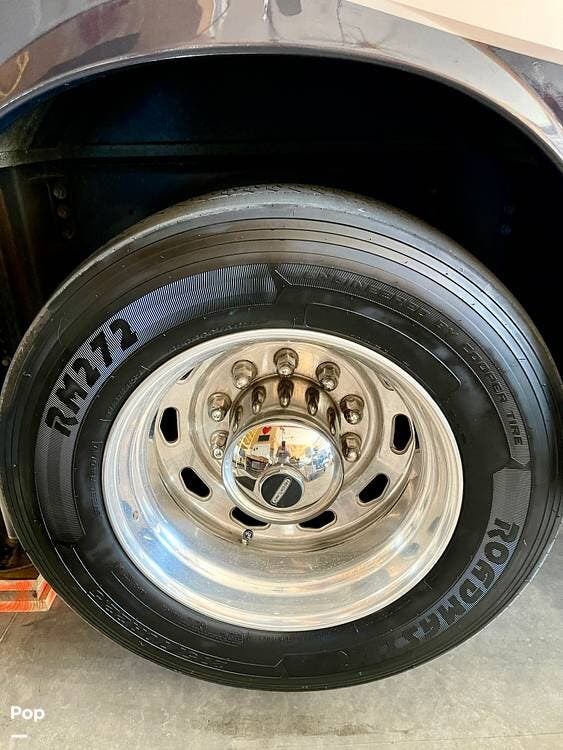 Outside, she has a Cummins Onan QD 10.0kW generator, three A/Cs, a roof access ladder external TV, shower, side, rear-view cameras, and Tyron bands on the front wheels for safety.
