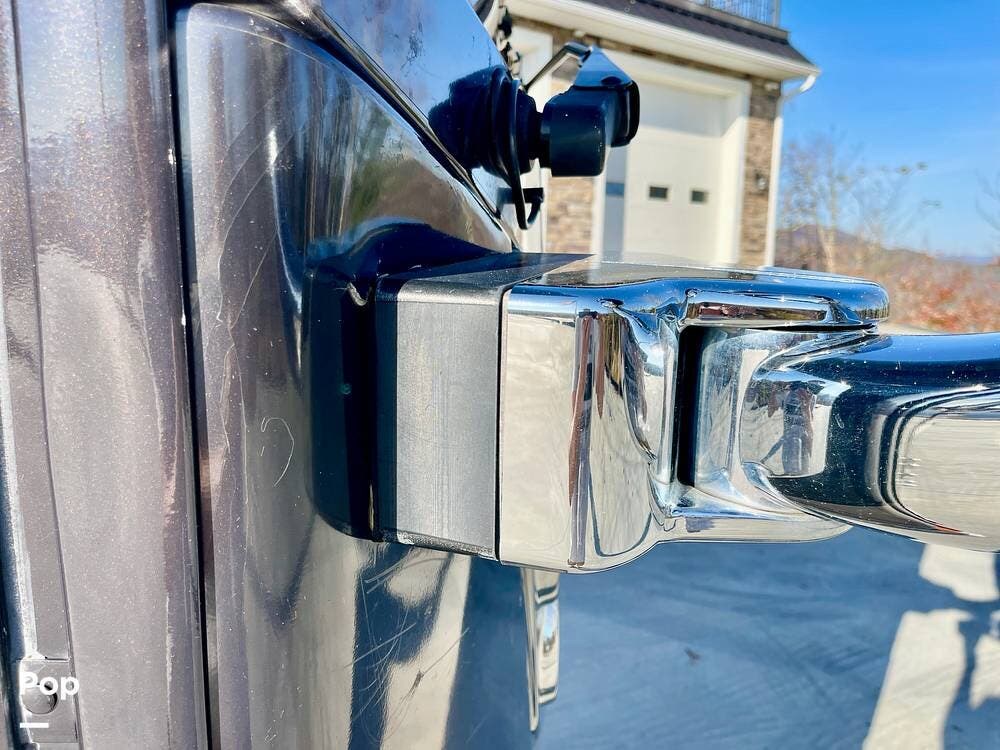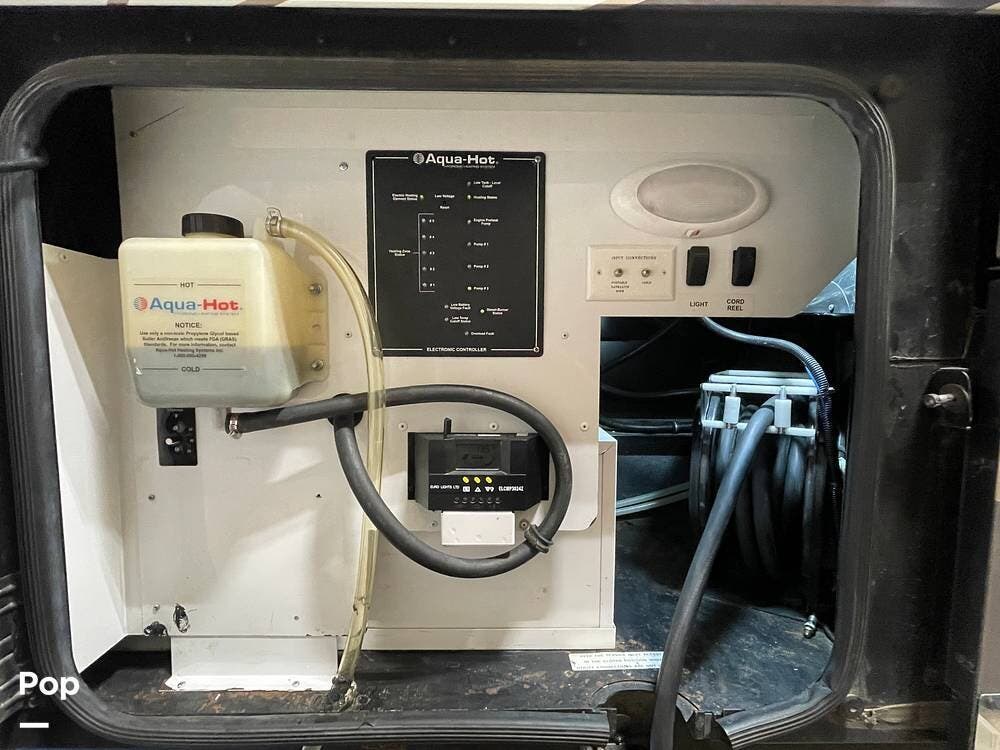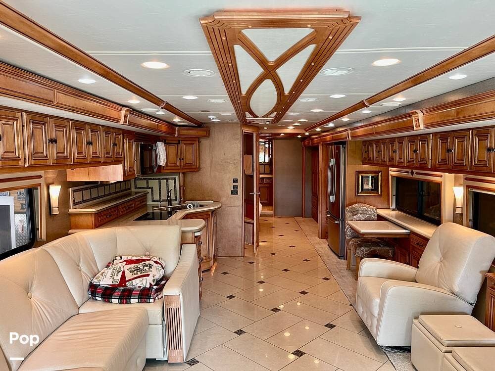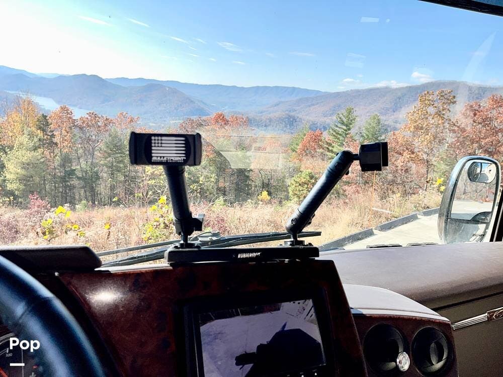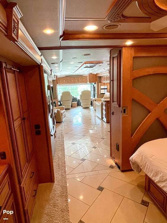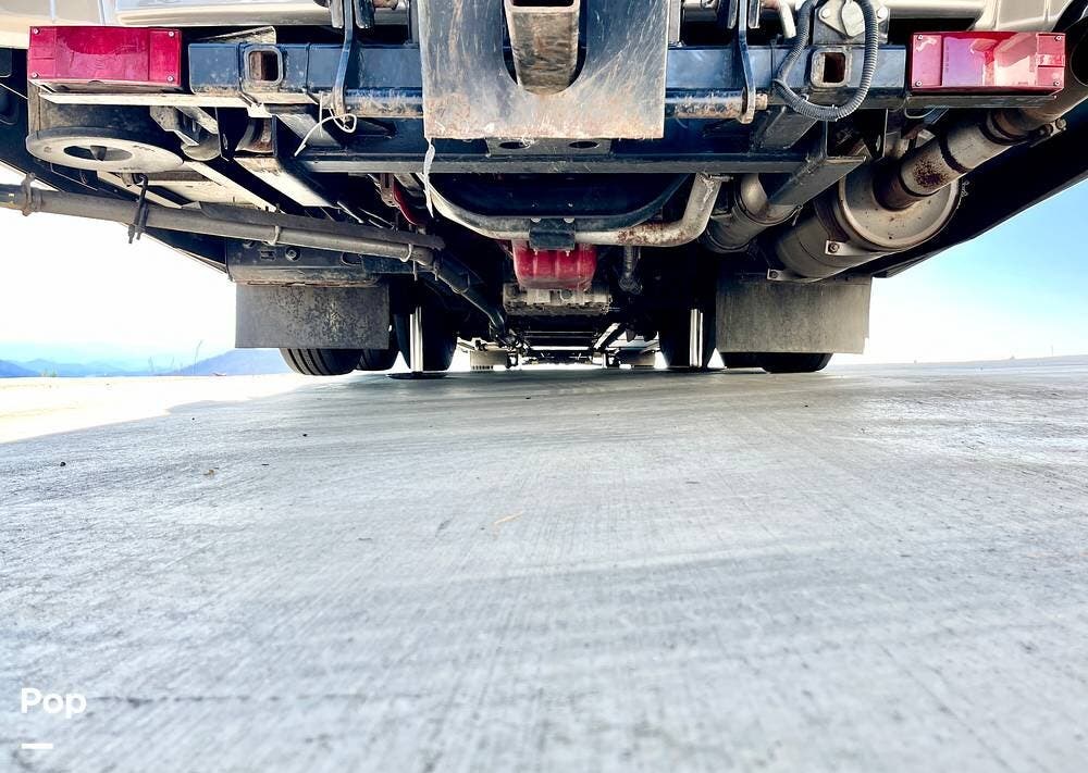 Outside, she has a Cummins Onan QD 10.0kW generator, three A/Cs, a roof access ladder external TV, shower, side, rear-view cameras, and Tyron bands on the front wheels for safety.