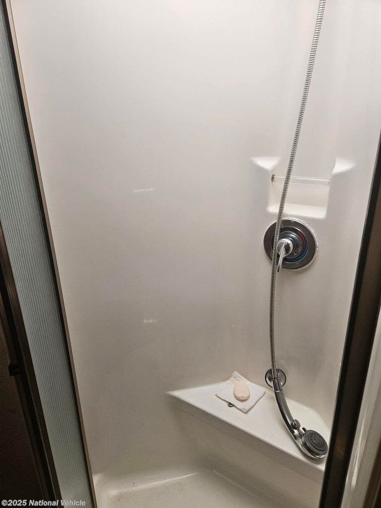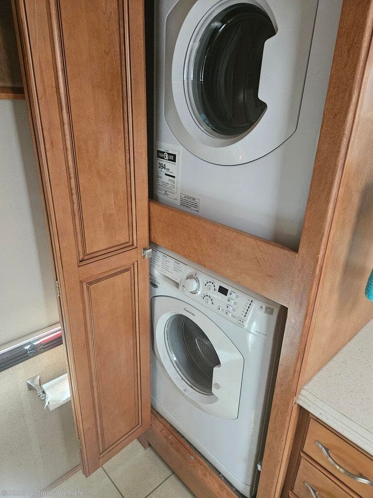 The master suite is a true retreat, with a king bed, large wardrobe, and rear master bath complete with dual sinks, a spacious shower, and ample cabinetry. A convenient half bath mid-coach ensures comfort for guests. With luxury details, washer/dryer, and plenty of storage, the Itasca Meridian 42E is the perfect Class A diesel pusher for travelers who want both refined comfort and long-haul capability.