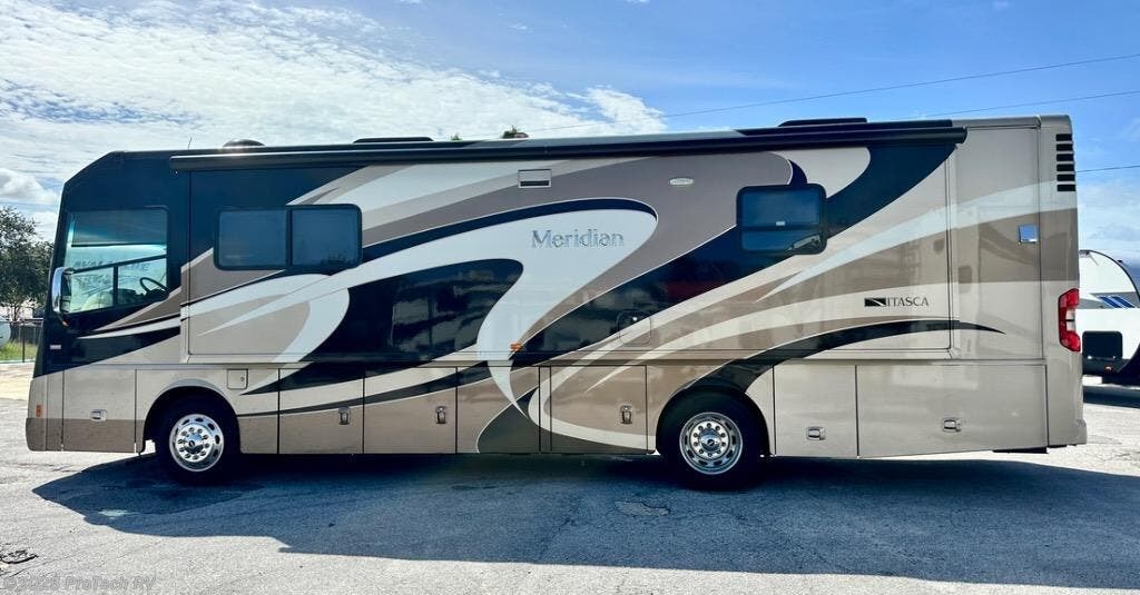 2013 Itasca Meridian 34B – Only 38,000 Miles – Excellent Condition Looking for a luxury Class A diesel pusher with low miles and premium features? This 2013 Itasca Meridian 34B has just 38,000 miles and is in excellent condition – ready for your next adventure. ? Cummins 340HP Turbo Diesel Engine – powerful, reliable, and fuel efficient ? Freightliner Chassis – smooth ride with air suspension ? 3 Slides – spacious interior with large living area ? Residential-Style Interior – solid surface countertops, premium cabinetry, and quality furnishings ? Full Kitchen – convection microwave, 3-burner cooktop, refrigerator/freezer ? Comfortable Bedroom – queen bed, wardrobe storage, and flat-screen TV ? Spacious Bathroom – full-size shower and quality fixtures ? Entertainment Package – multiple TVs, sound system, and satellite ready ? Washer/Dryer Included ? Ample Basement Storage with pass-through compartments with slide Tray This coach has been meticulously maintained, stored properly, and it shows. With only 38,000 miles, it’s barely broken in and has many years of reliable travel ahead!