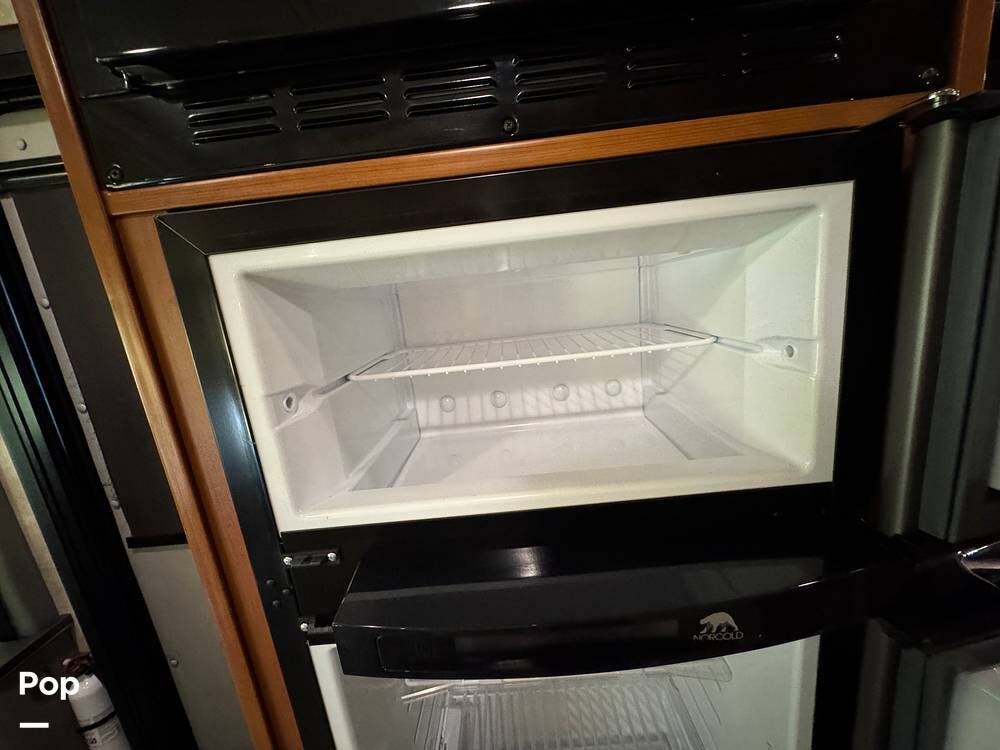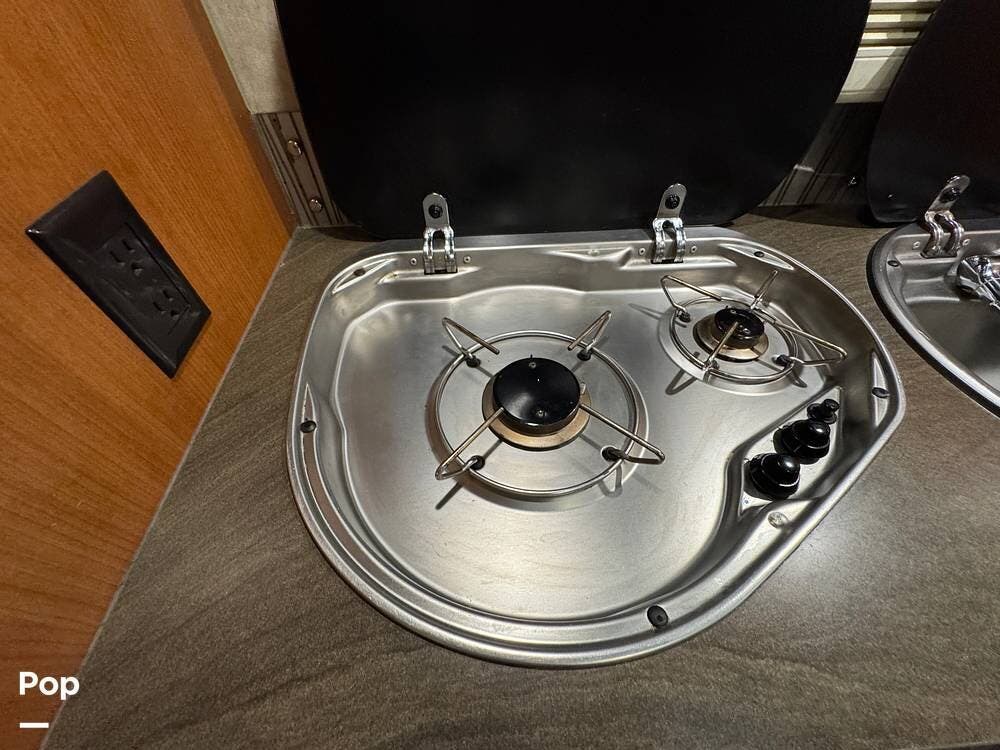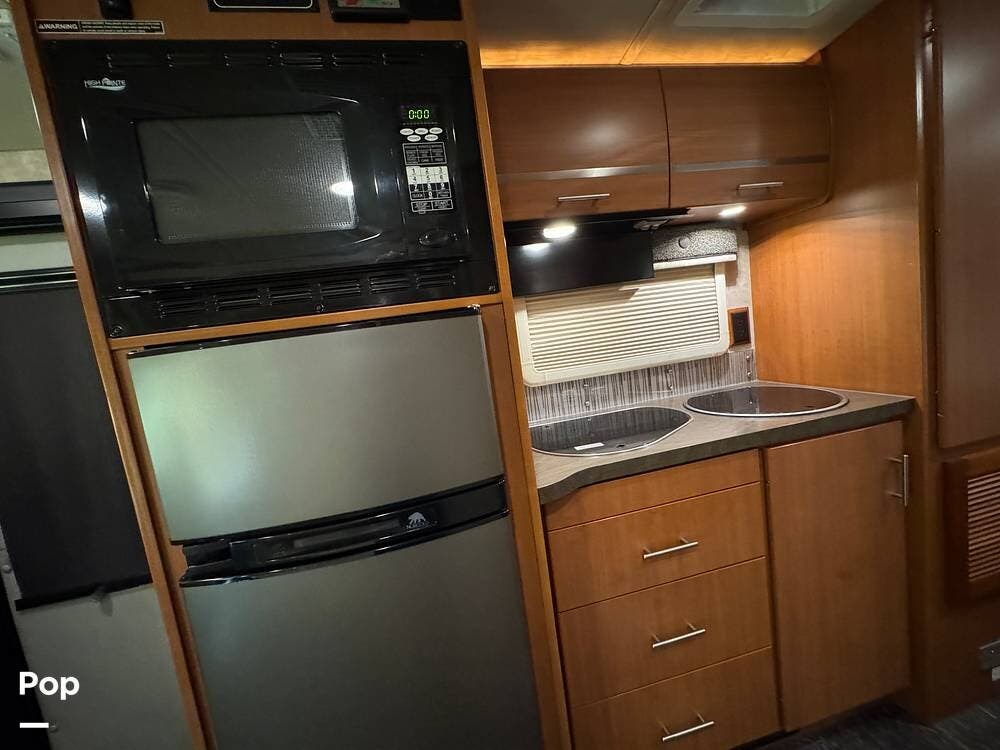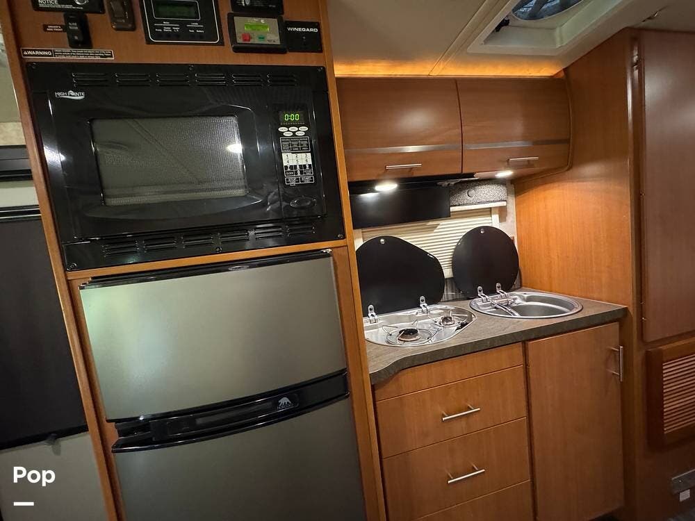 The galley is fully equipped with a laminate countertop, two-burner range, stainless steel sink, refrigerator/freezer, and convection microwave -- perfect for preparing meals on the road.