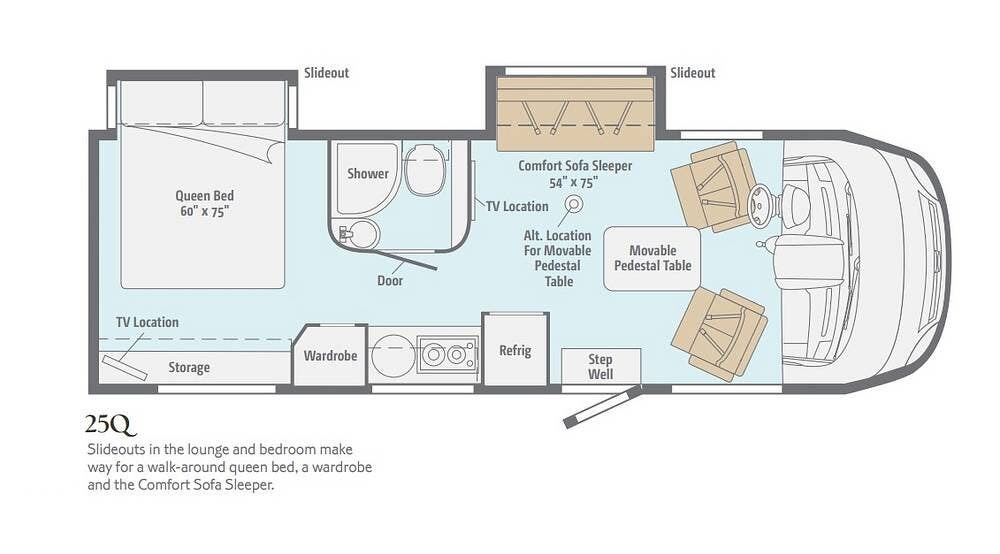 The smart 25Q floorplan offers a welcoming living area with a sleeper sofa, plus a private rear bedroom with a queen bed for restful nights.