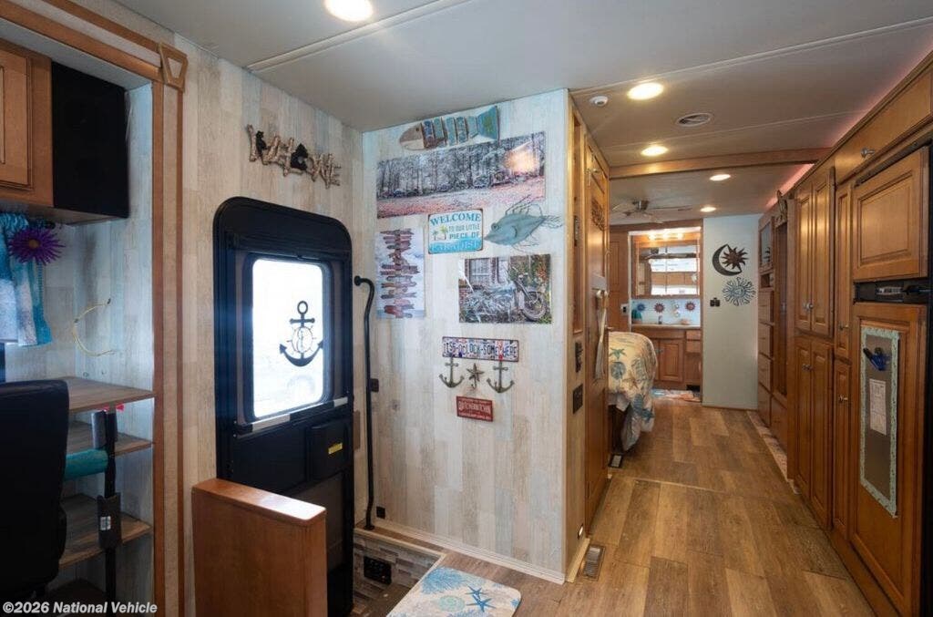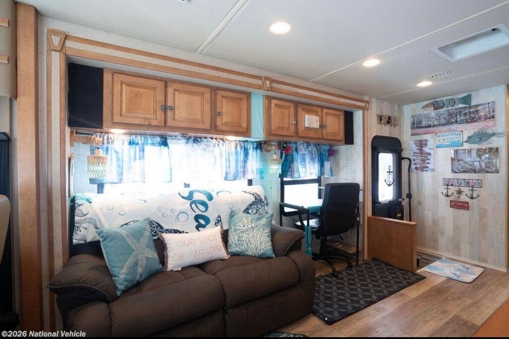 Inside, the coach feels warm and upscale with solid oak cabinetry throughout, new laminate flooring, updated lighting, freshly papered walls, and a thoughtfully customized living space. The original couch has been replaced with a rocking reclining loveseat, and the dinette has been upgraded to a pull-out table with chairs. A desk and office chair replace the original sofa/chair setup, making this an excellent choice for work on the road.