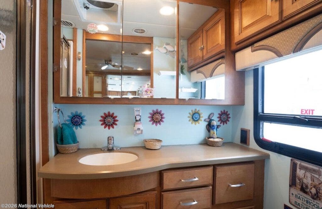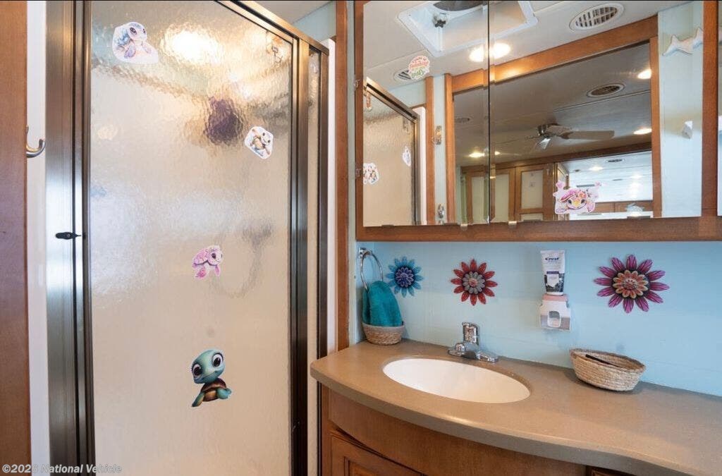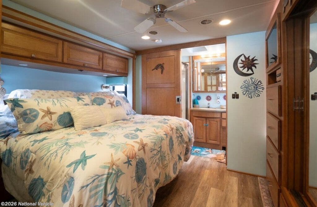 The kitchen is fully equipped with Corian countertops, stovetop, convection microwave oven, and refrigerator/freezer. Climate control is handled by two A/C units and a furnace, keeping the coach comfortable year-round.