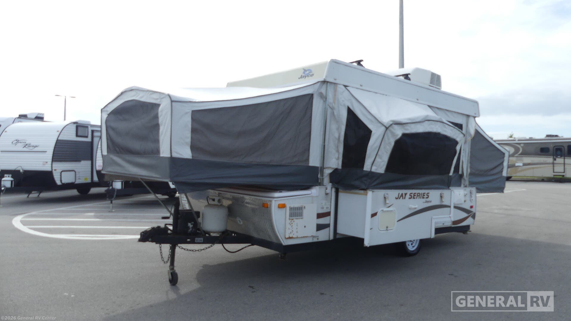 Single Slide Jay Series, Queen & King Tent End Beds, J-Steel Sofa, Slideout Booth Dinette, Porta-Potti Cabinet, Single Galley Sink, 2 Burner Cooktop, Water Heater, Carryout Stove, Outside Shower, Storage Cabinets & Much More.