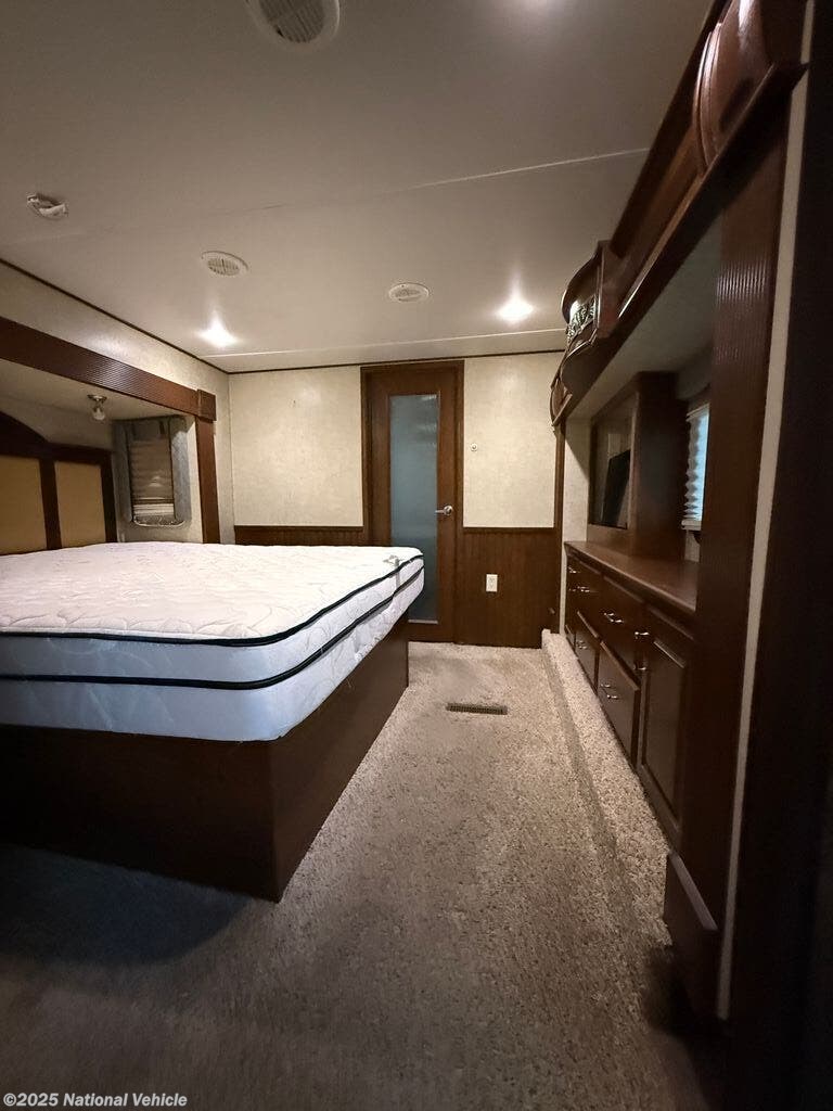 One of the standout features of the 3720FB is its expansive front full master bath with dual sinks, a large walk-in shower, generous linen storage, and a deep wardrobe closet?bringing true residential convenience to your travels. The master suite features a comfortable king bed, dresser, and additional storage, along with direct access to a mid-coach half bath, giving guests added convenience and keeping the main bath private.
