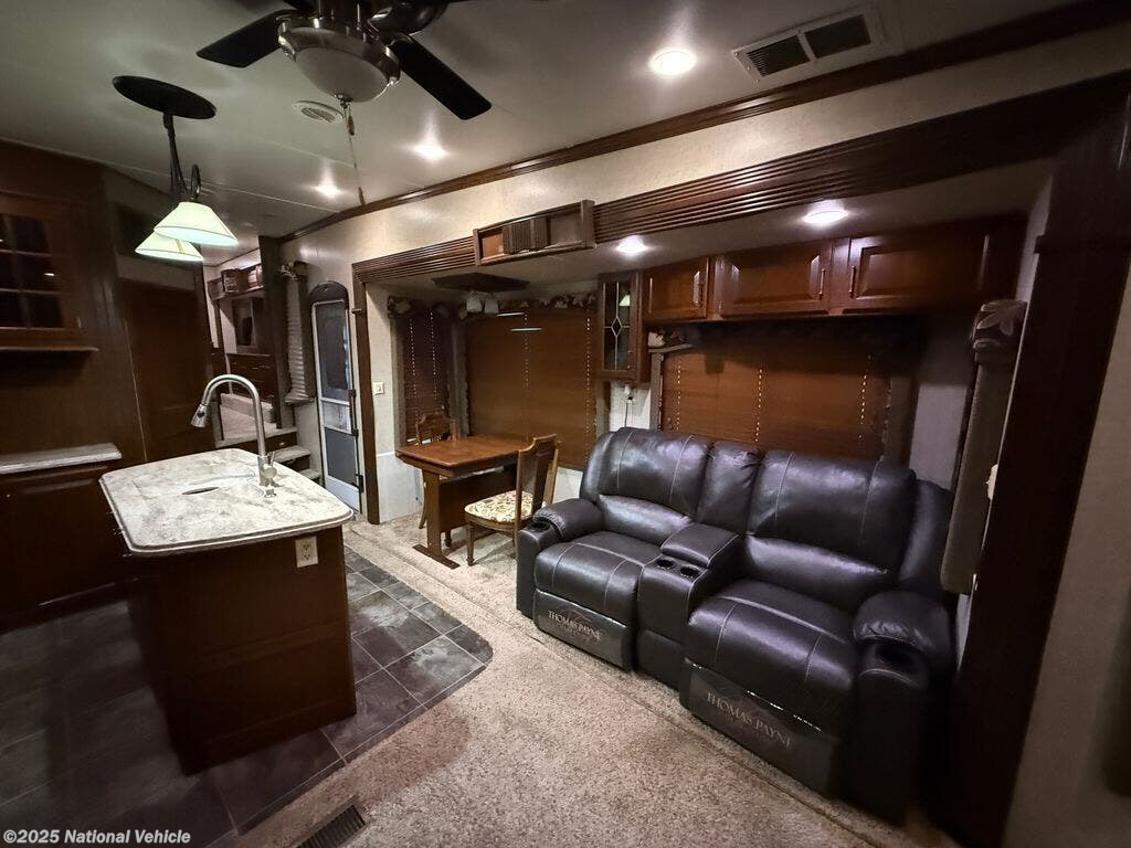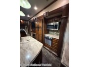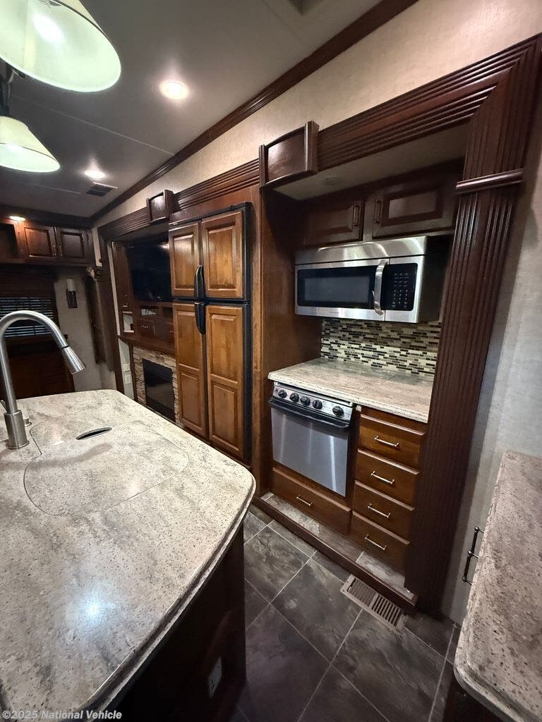 Step inside to a warm, elegant interior highlighted by rich cabinetry, solid-surface countertops, upgraded lighting, and premium d?cor throughout. The rear-living layout offers abundant seating with plush theater-style recliners, a large sofa sleeper, and a full entertainment center with fireplace?perfect for cozy nights wherever the road takes you. The spacious kitchen is ideal for cooking at home, equipped with a residential-style refrigerator, large pantry, three-burner range, microwave, and an island that provides excellent prep and storage space.