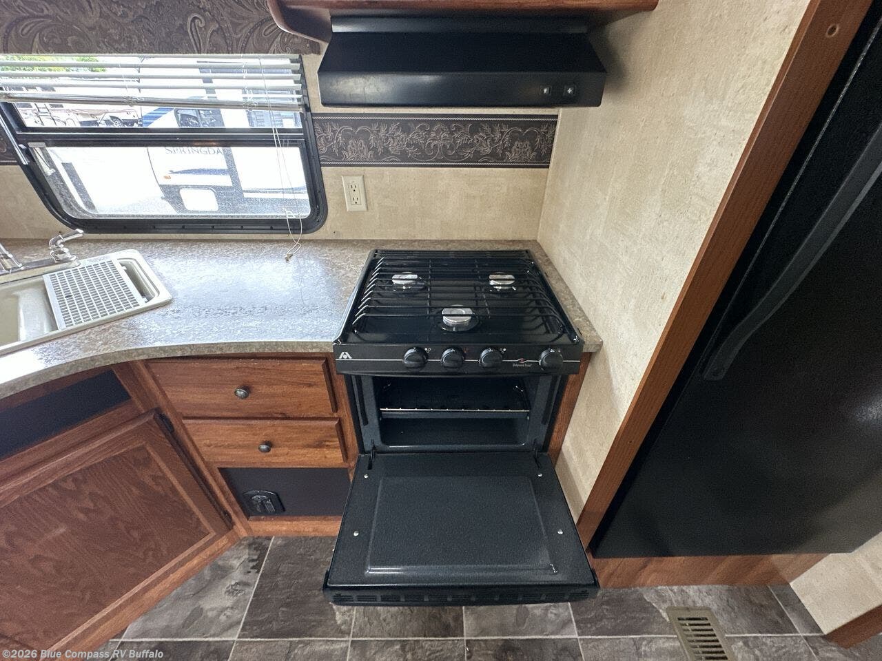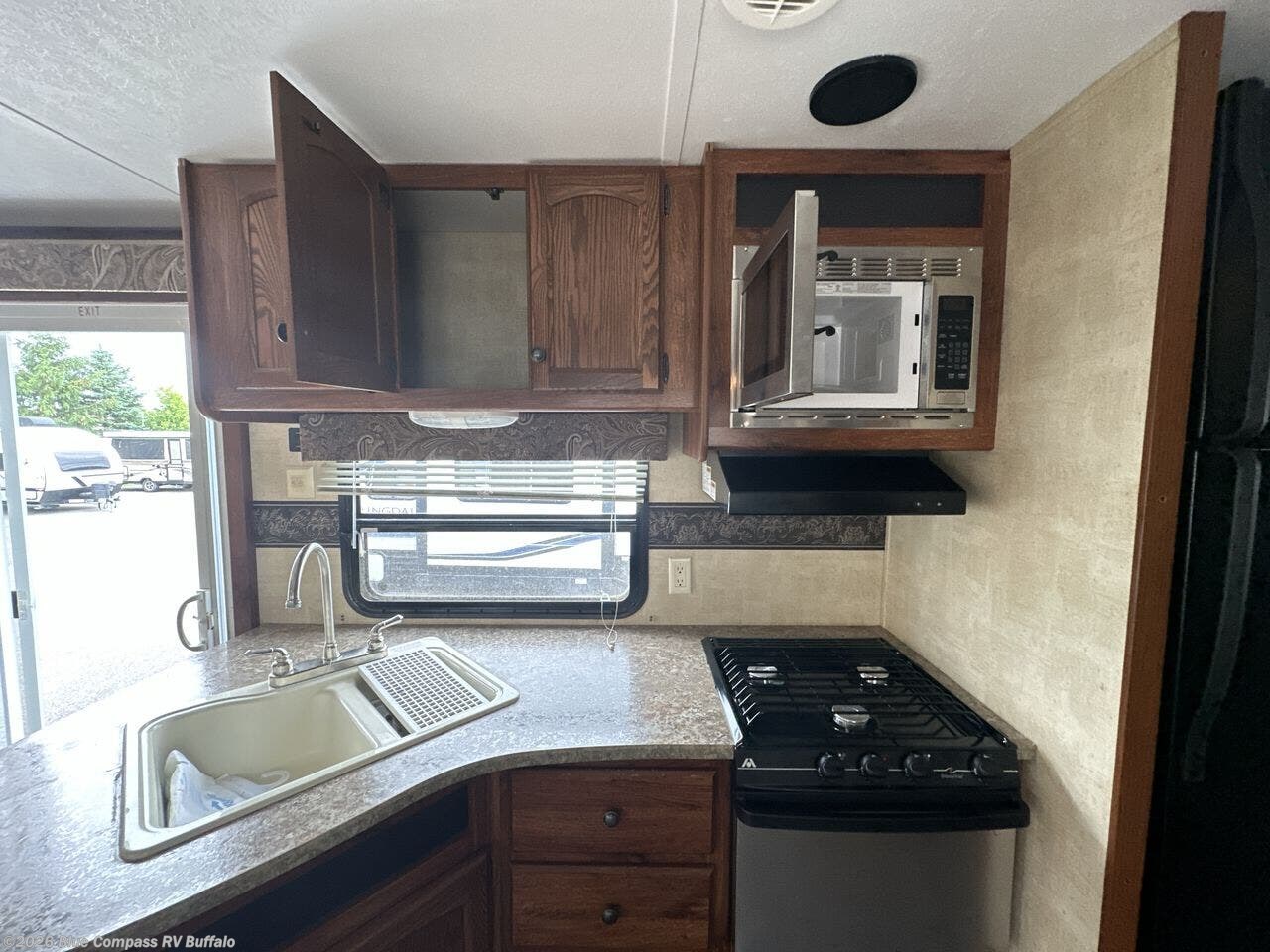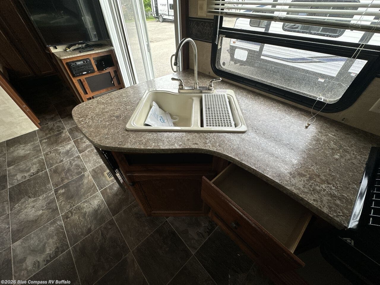 The kitchen features everything you need to easily prepare and cook food for your family. There are double sinks, a three burner range, refrigerator, and pantry just off the dinette slide.
