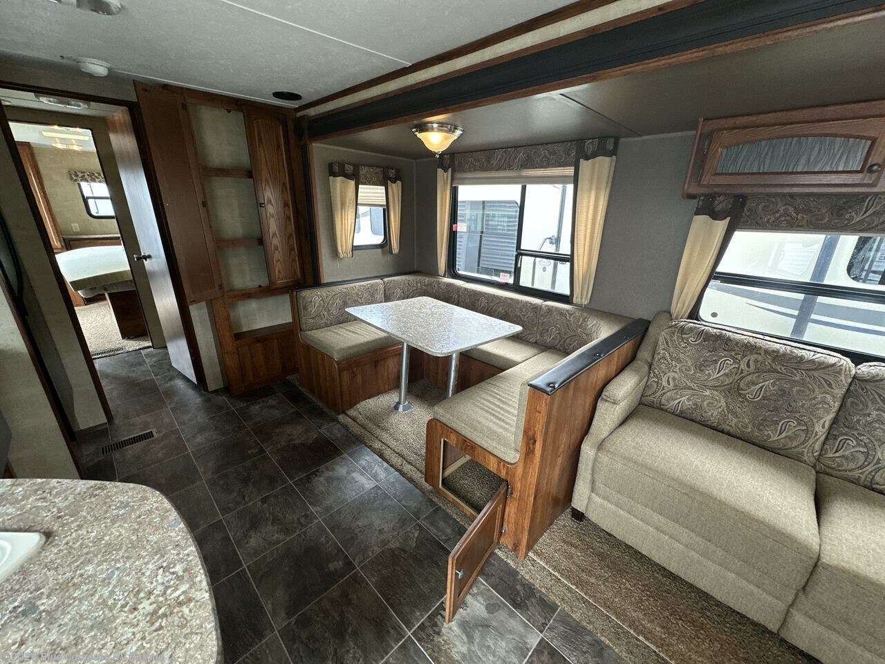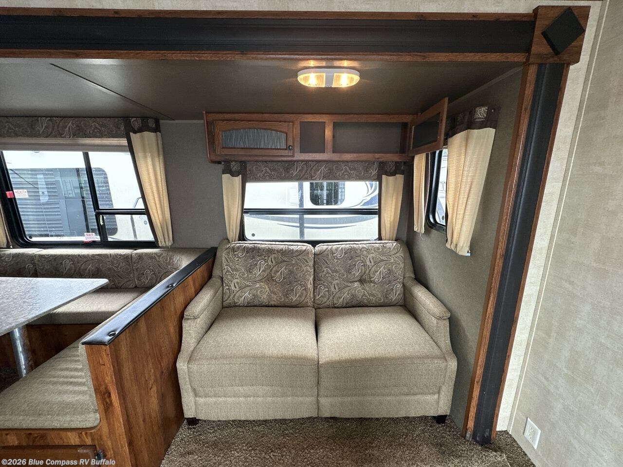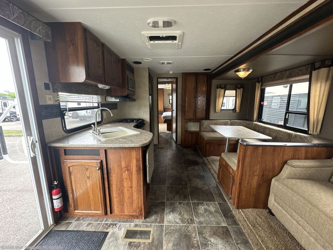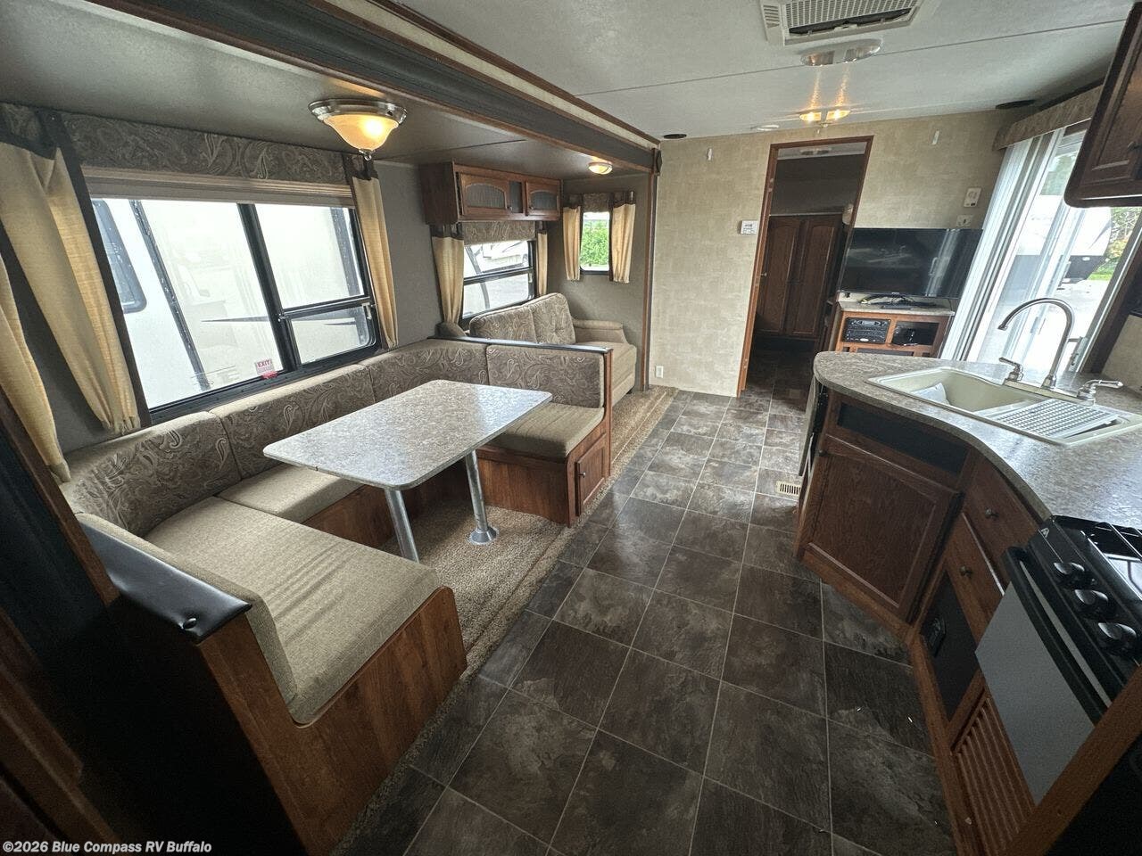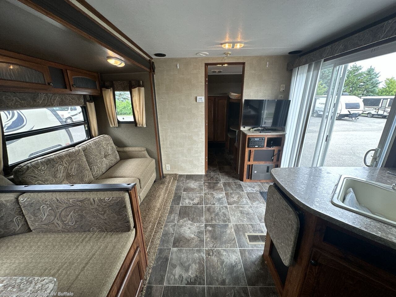 Head inside through the sliding glass patio doors and find an open concept kitchen and living area with entertainment center to the right of the door, and a large slide out sofa and u-shaped dinette opposite. You can choose an optional tri-fold sleeper sofa if you like.