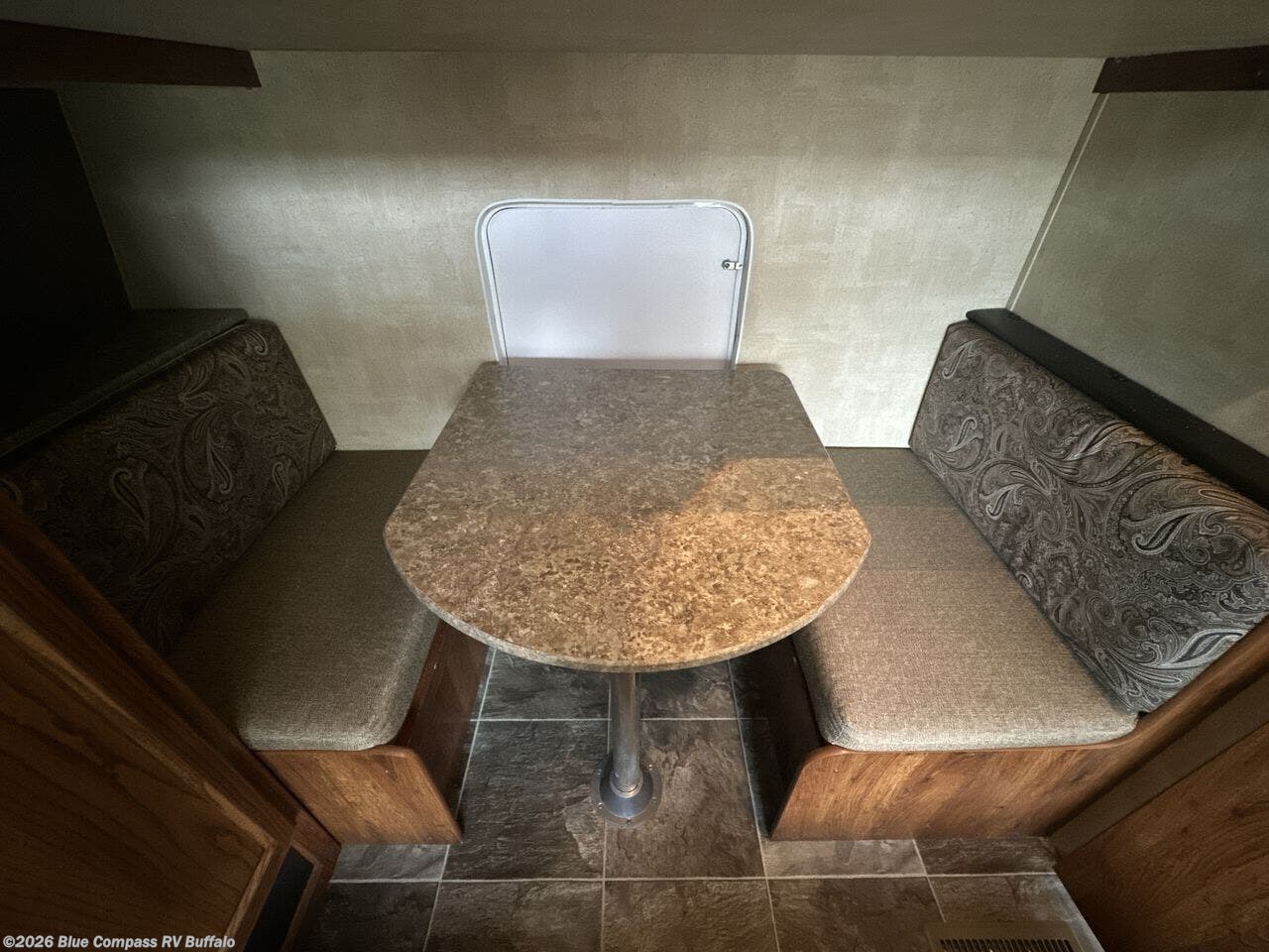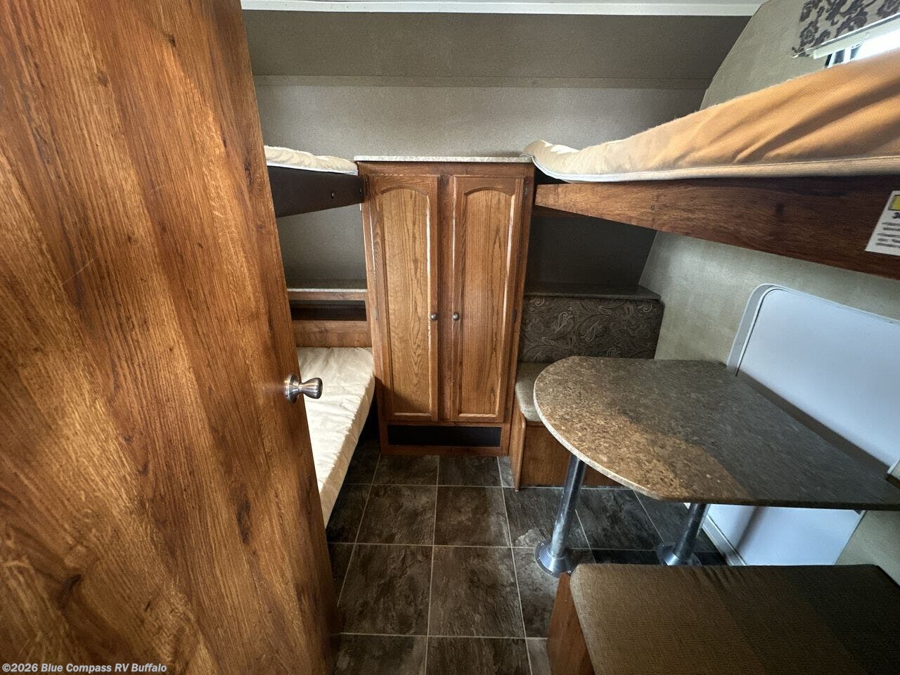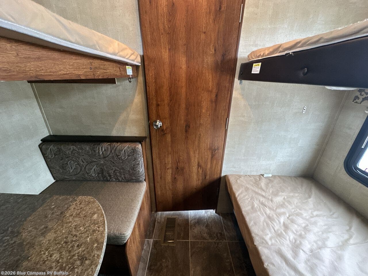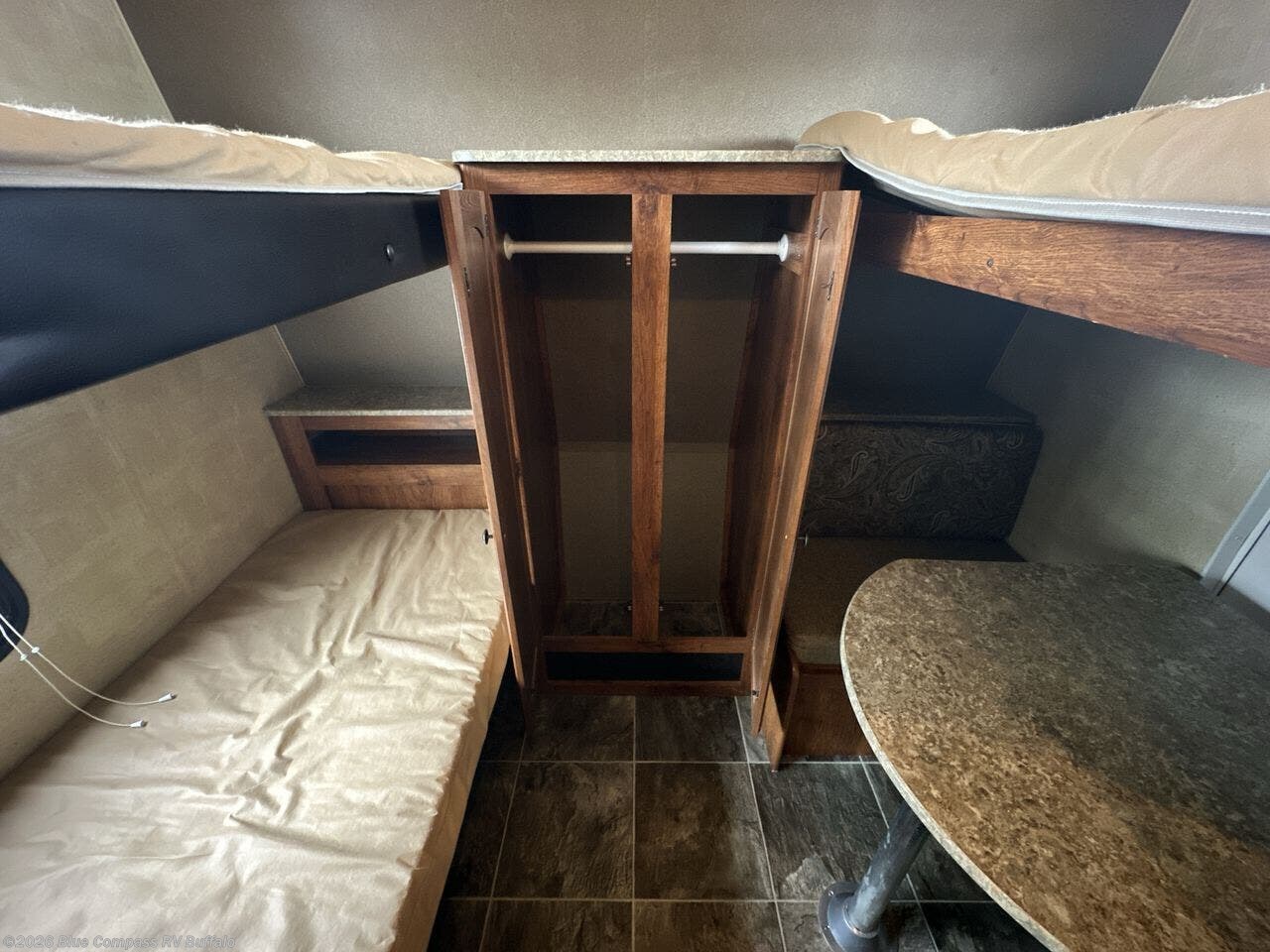 The front bunk room provides a set of bunks, and a dinette with folding bunk above on the opposite side. There is a handy storage closet in front between the bunks.