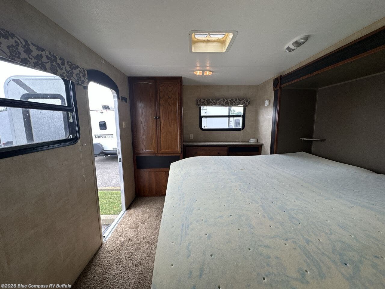 A private rear bedroom offers a private entry door to the outside. Inside find a king bed slide, a rear wall dresser and wardrobe, plus so much more!