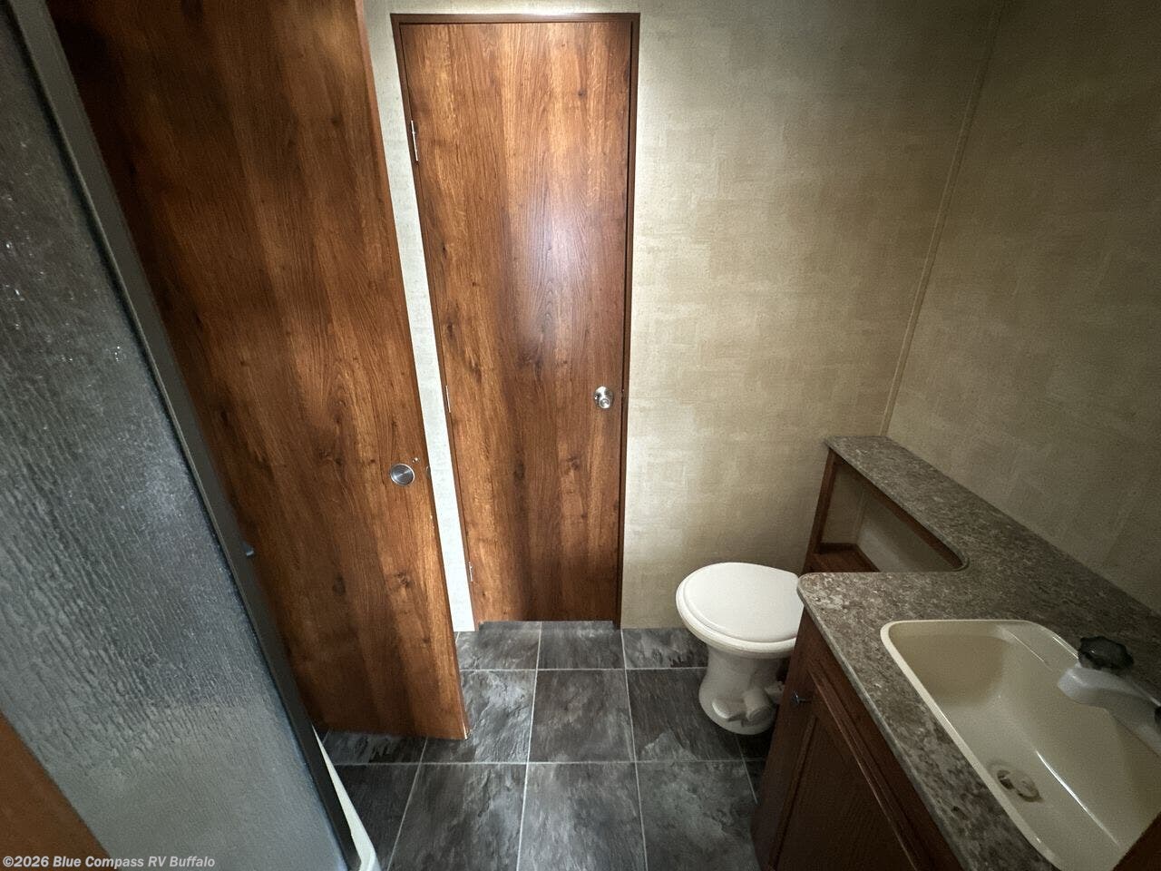 Just passed the kitchen area head through the walk-through bath featuring a shower on the right, and vanity with sink and toilet on the left.