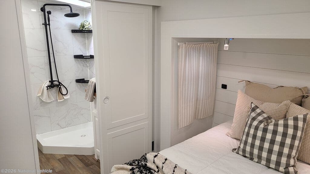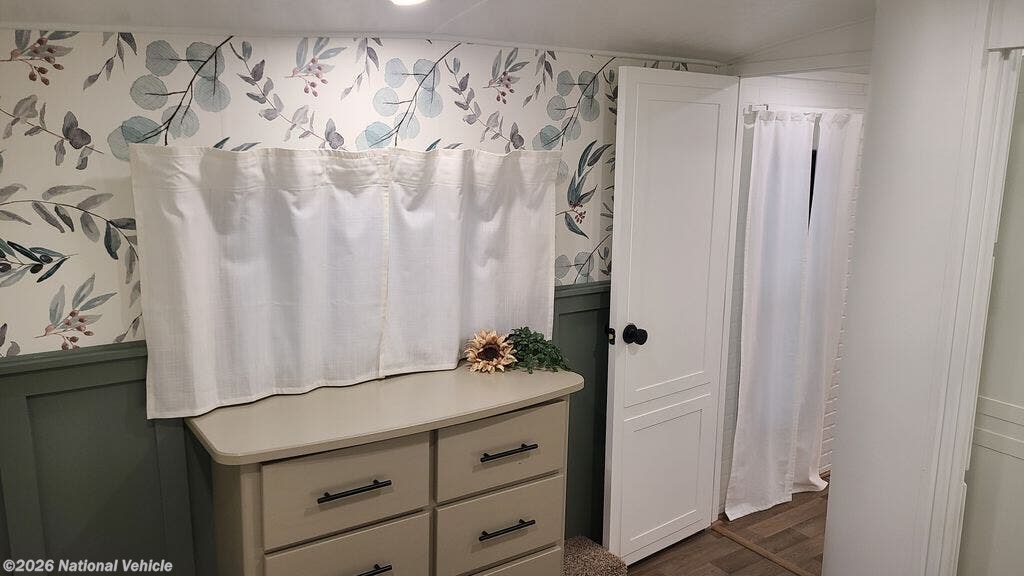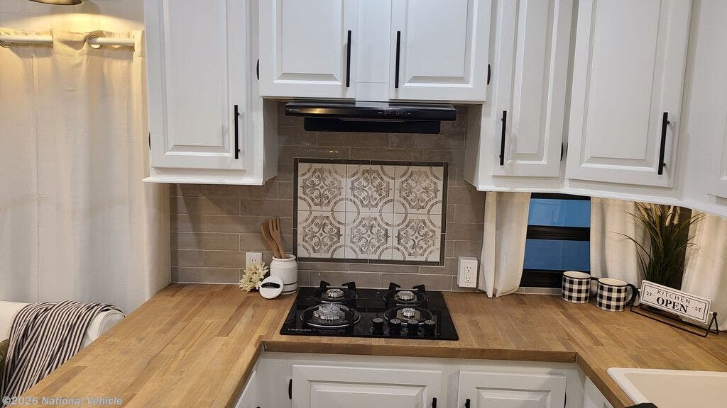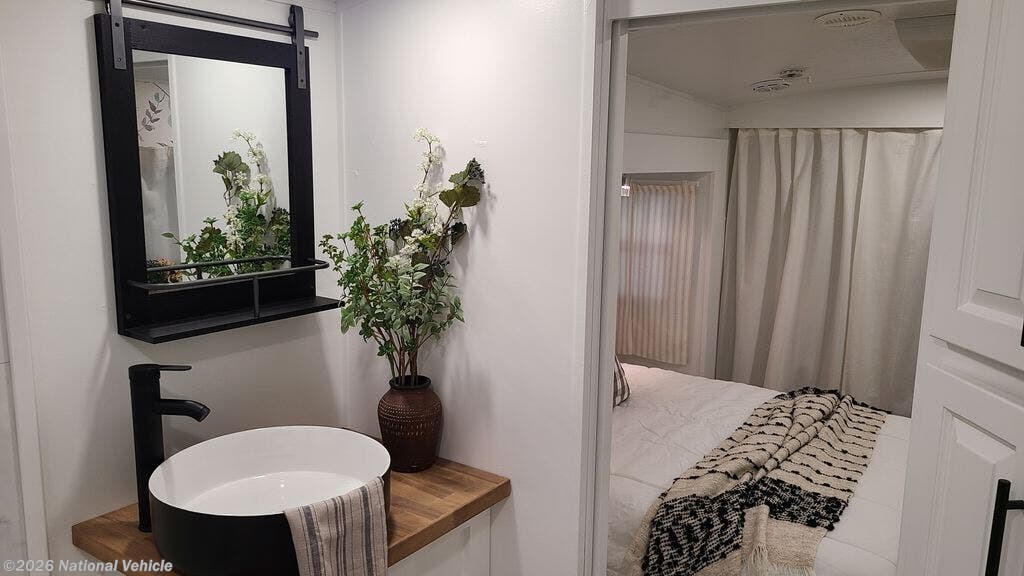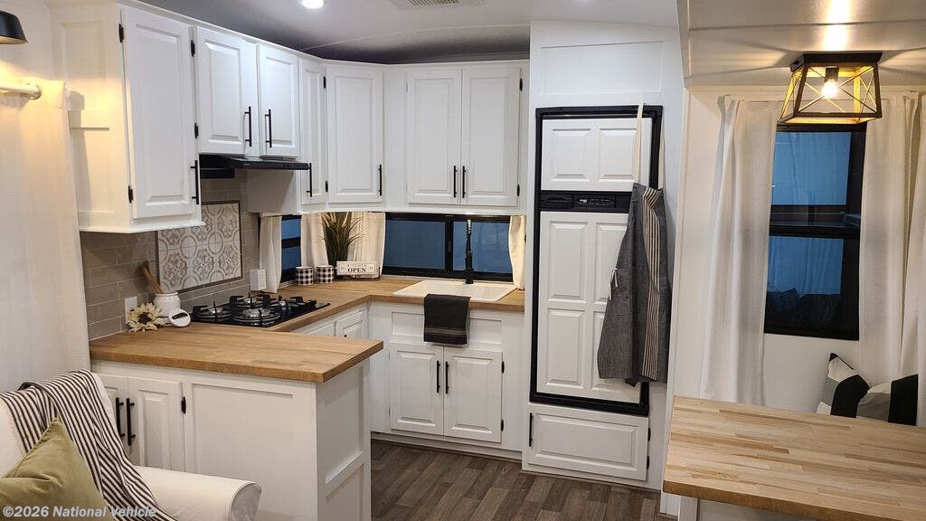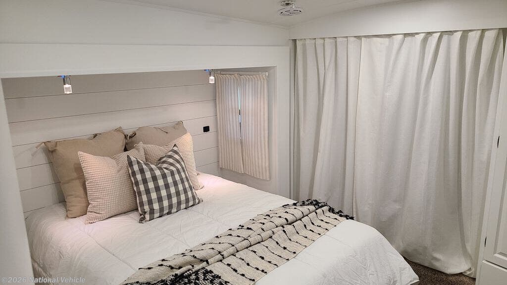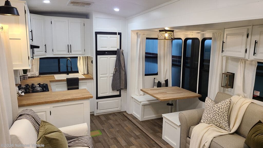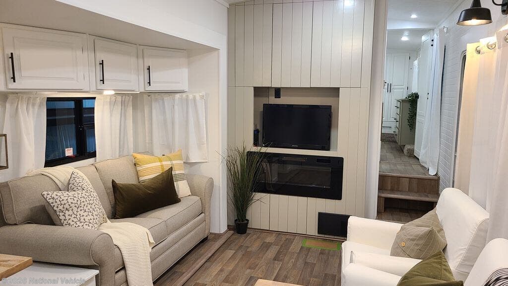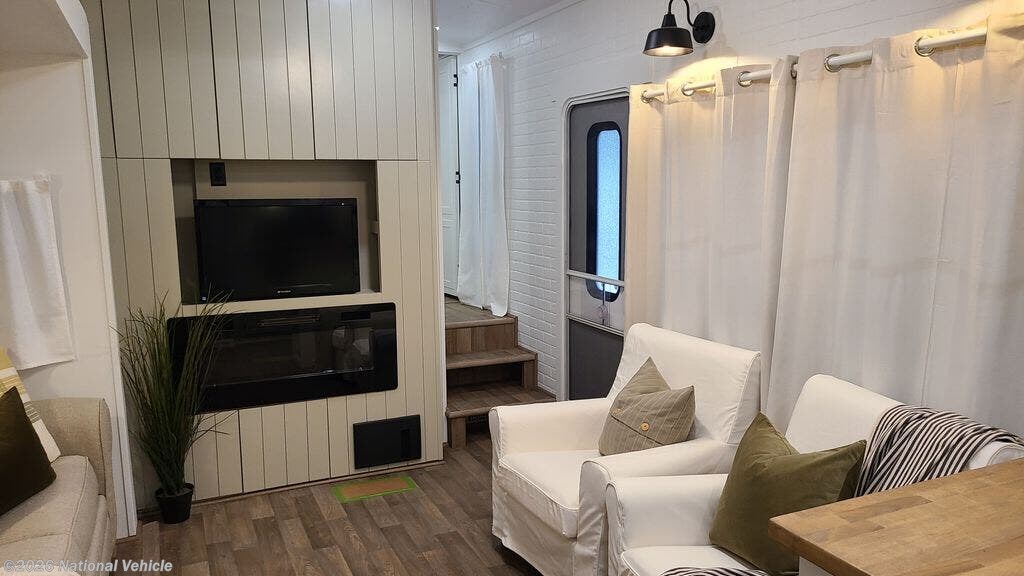 Inside, you?ll find a modern appointed rear kitchen with new counter tops, new appliances, cabinets, fixtures, sink, and tile. The stunning living area slides out for spacious new seating with new electric fireplace and TV, creating a welcoming space to relax and entertain. A pretty new dinette and plenty of windows brighten the interior and overlook scenic views from wherever you?re parked.