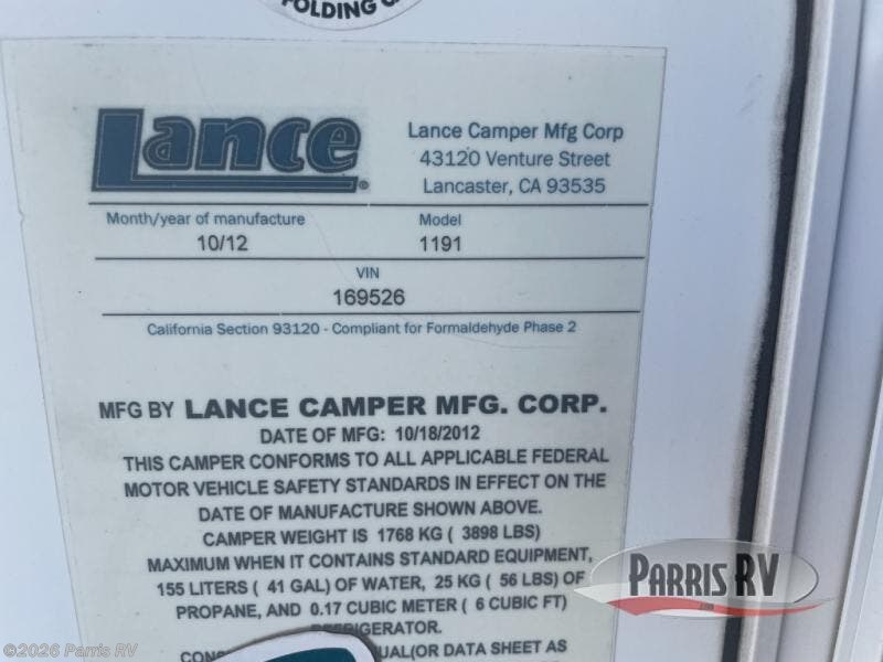 Request More Info on this 2013 Lance Lance 1191 Offered for sale by Parris RV