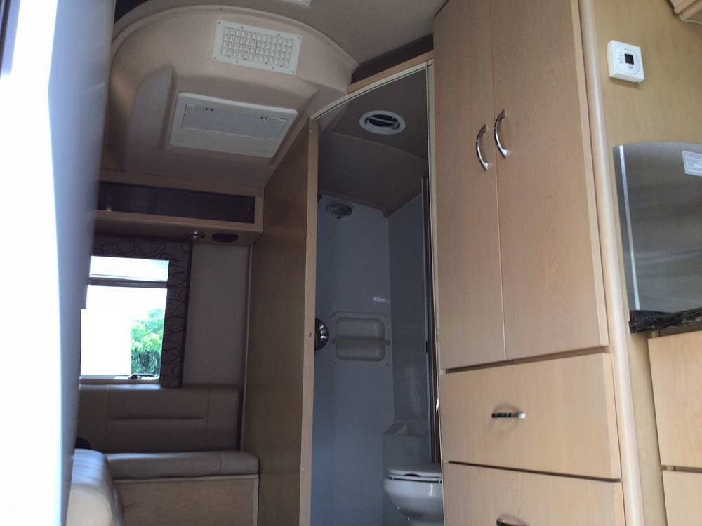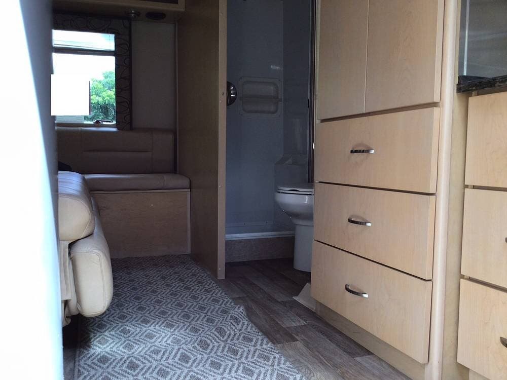 This Serenity has a rear sofa that converts to a queen bed. You have direct access to the bathroom. The shower is surprisingly large! Truly fit for a king and queen!
