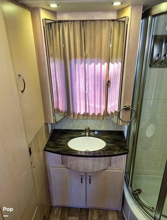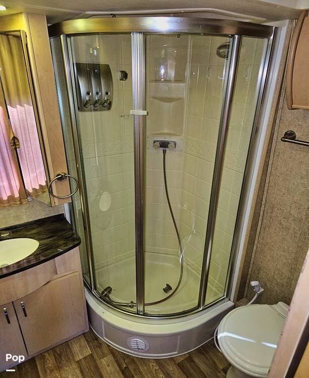 In the rear, the spacious dry bathroom--a hallmark of Leisure Travel's intelligent design--offers a real shower, porcelain toilet, vanity, and enough room to change comfortably, a rare luxury in a Class B+ coach.