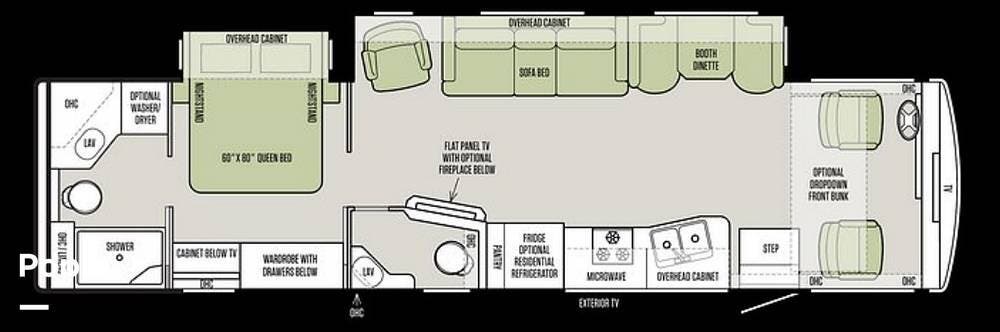 The galley has all the amenities you need to prepare meals and snacks. They include a convection microwave, a 4-door refrigerator, a stove, ample counter space, and a double kitchen sink. Beautiful hardwood cabinets throughout and a dinette. The plush sofa has a pull-out chaise lounge across from a large TV above a fireplace. And a half bath for you and your guests.