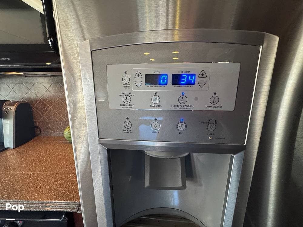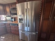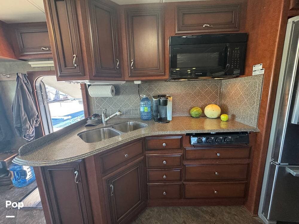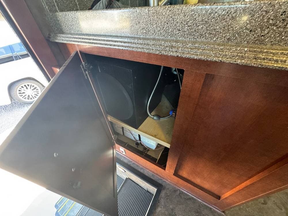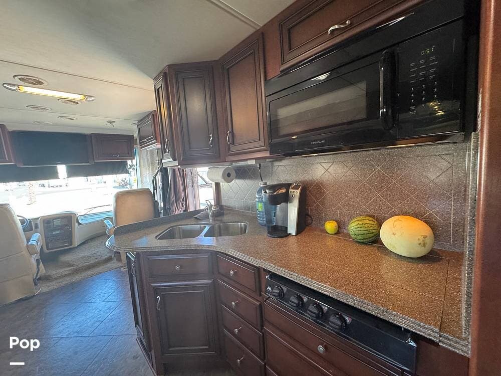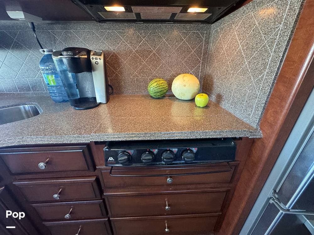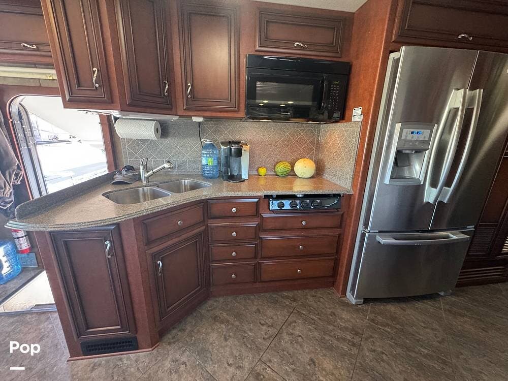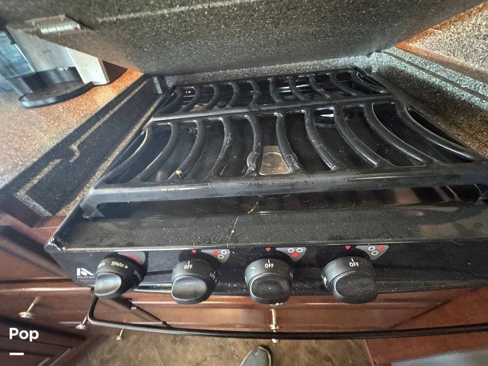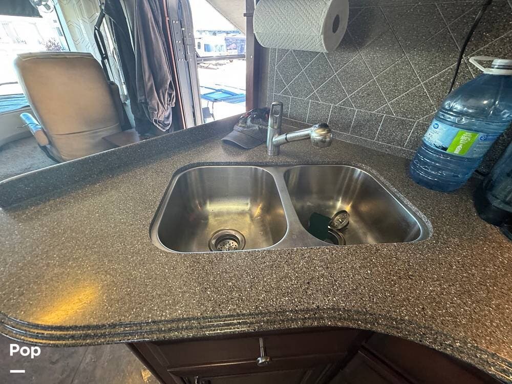 The kitchen is well-appointed for extended trips or full-time living: dual stainless-steel sinks, a three-burner range, and a substantial refrigerator are typical. Solid-surface countertops, a pantry, and ample storage make food prep comfortable.