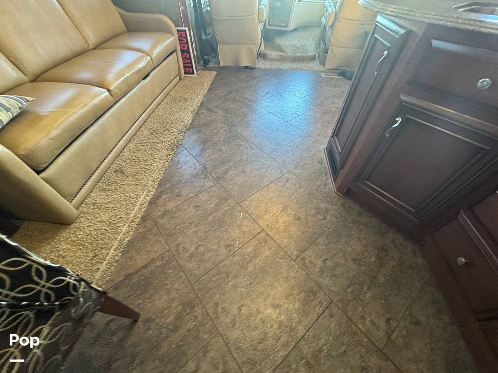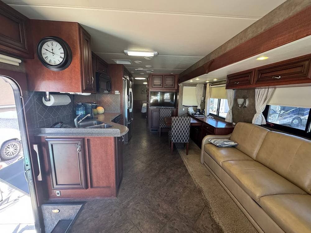 The living area is outfitted with Flexsteel Ultralux leather furniture, contributing comfort and sophistication. Vinyl tile flooring runs through the kitchen, living area, and bathroom, making the space both practical and elegant.
