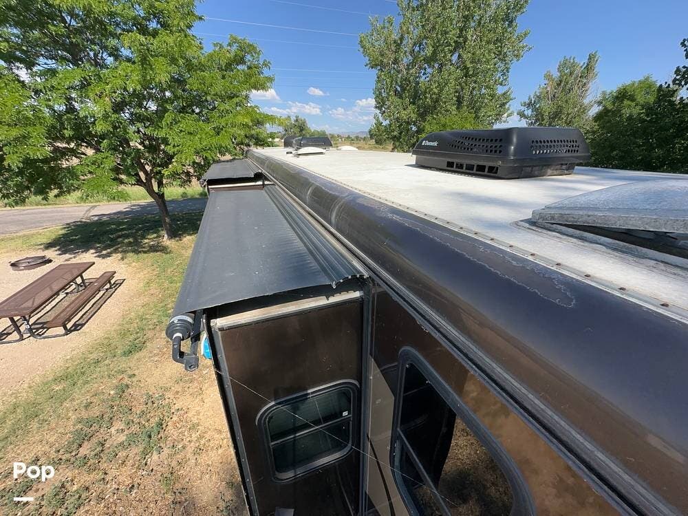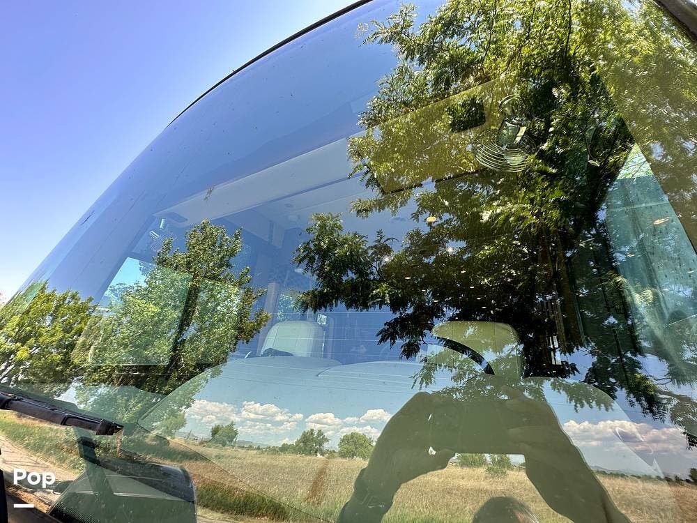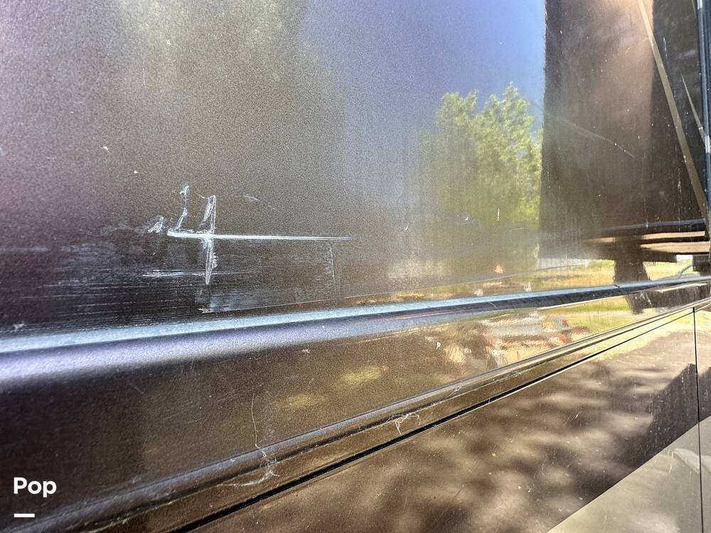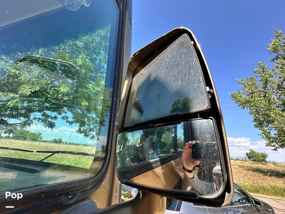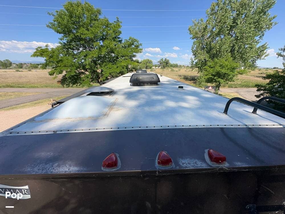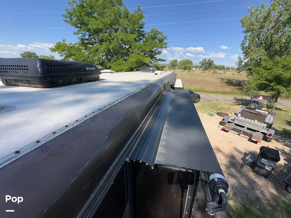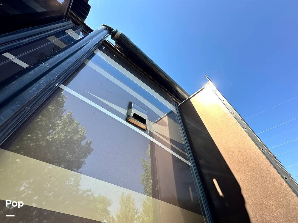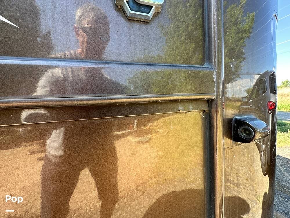 The exterior features include full body paint, double-pane tinted windows, two 13,500 btu AC units, rear and side view cameras, a 5.5kW Cummins Onan generator, a 10k tow capacity to take your vehicle or toys along, and a roof access ladder.