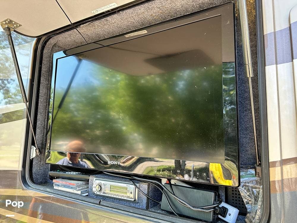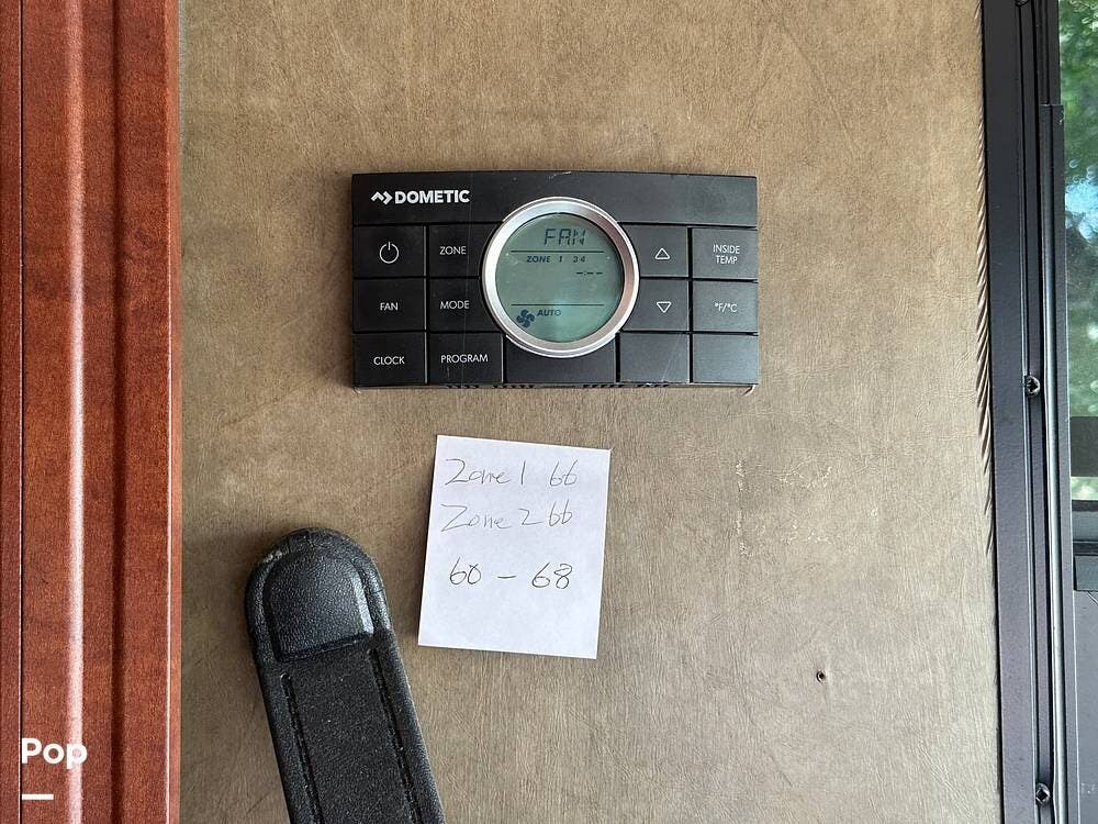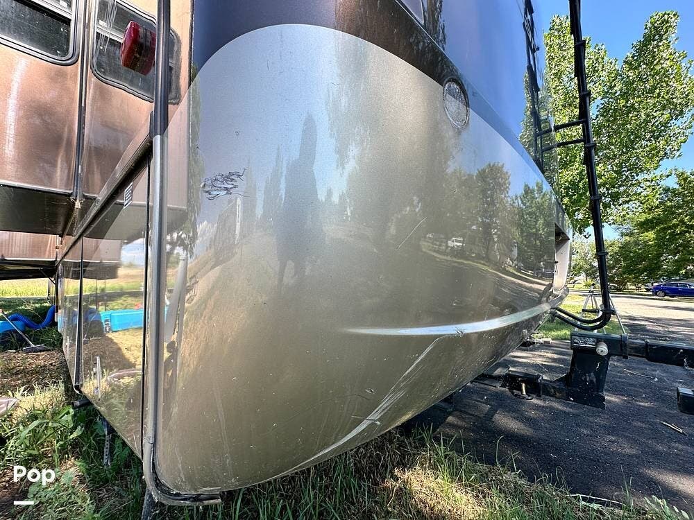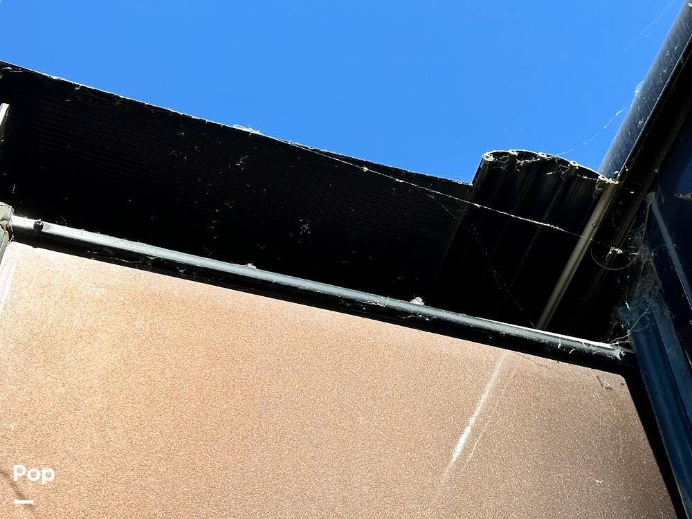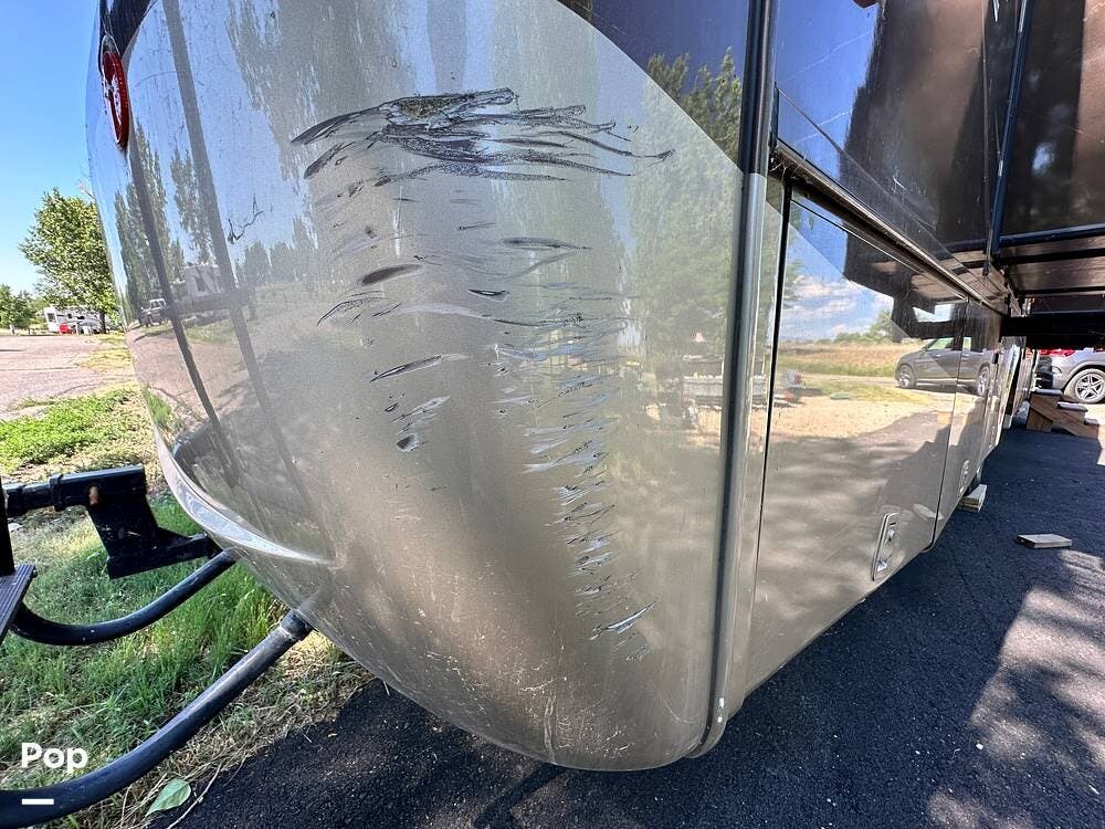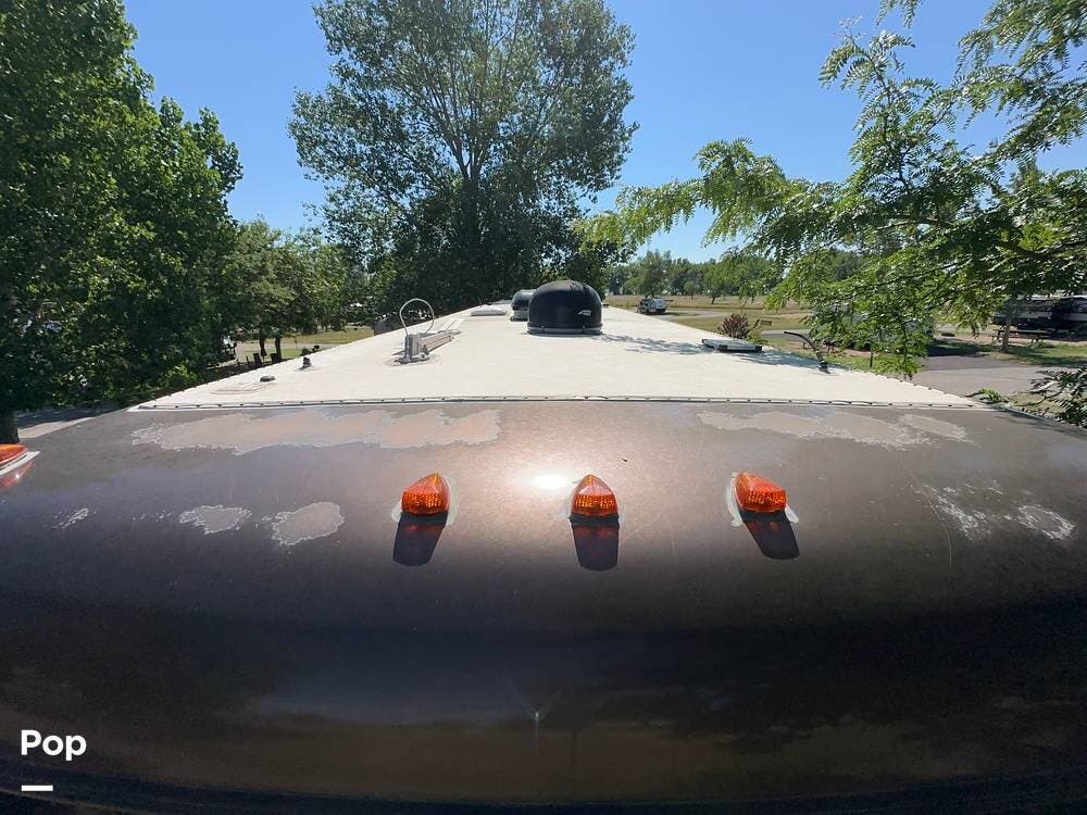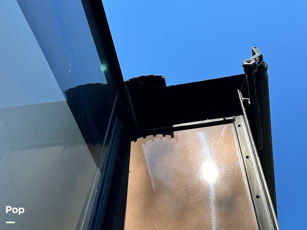The exterior features include full body paint, double-pane tinted windows, two 13,500 btu AC units, rear and side view cameras, a 5.5kW Cummins Onan generator, a 10k tow capacity to take your vehicle or toys along, and a roof access ladder.