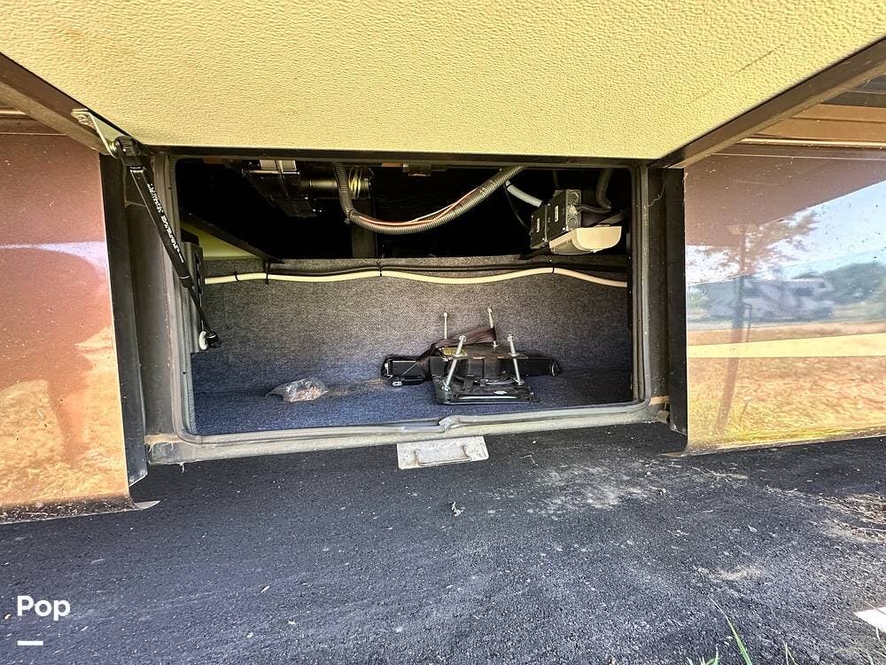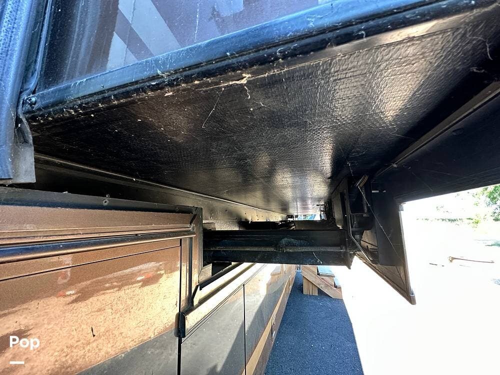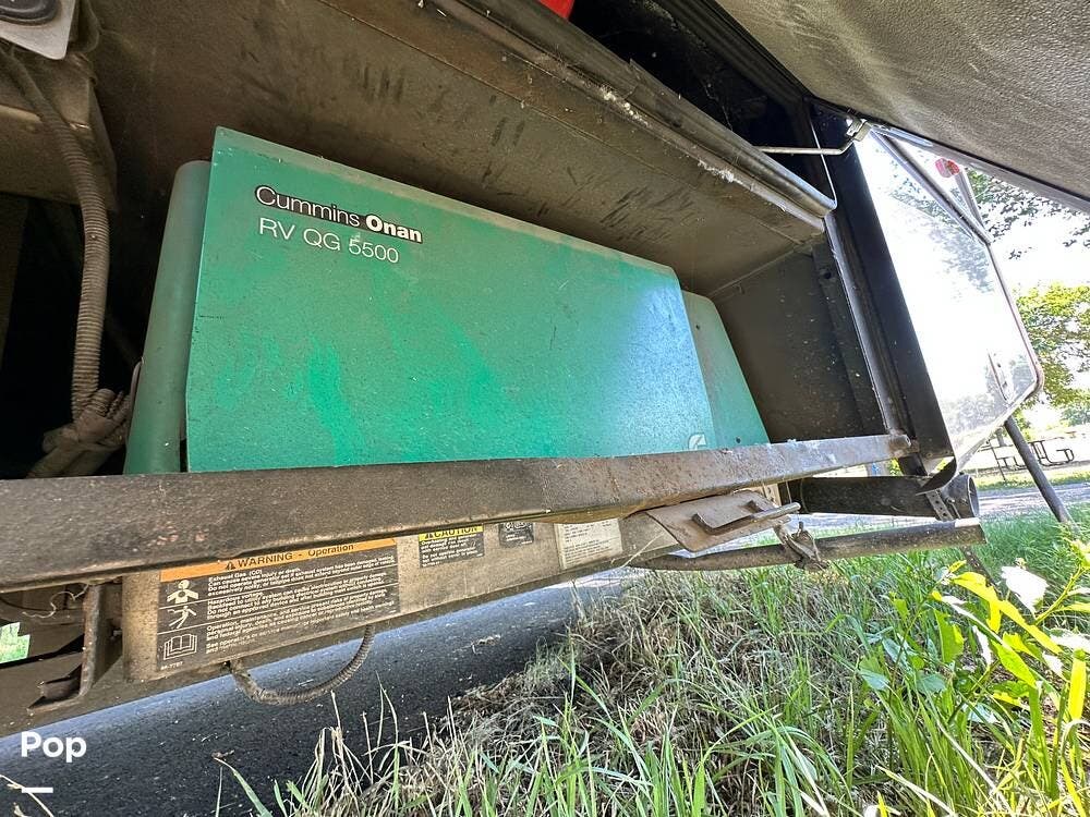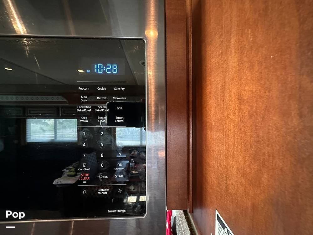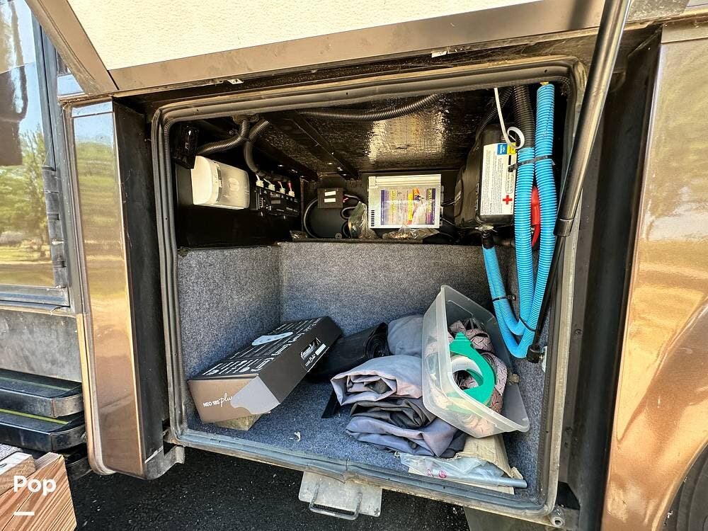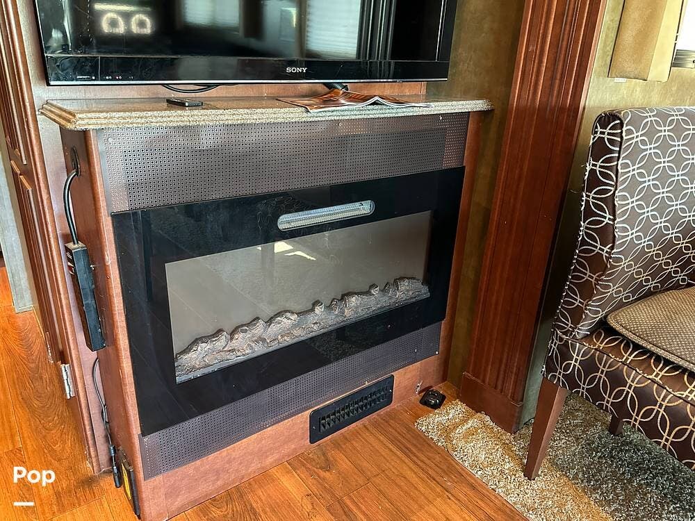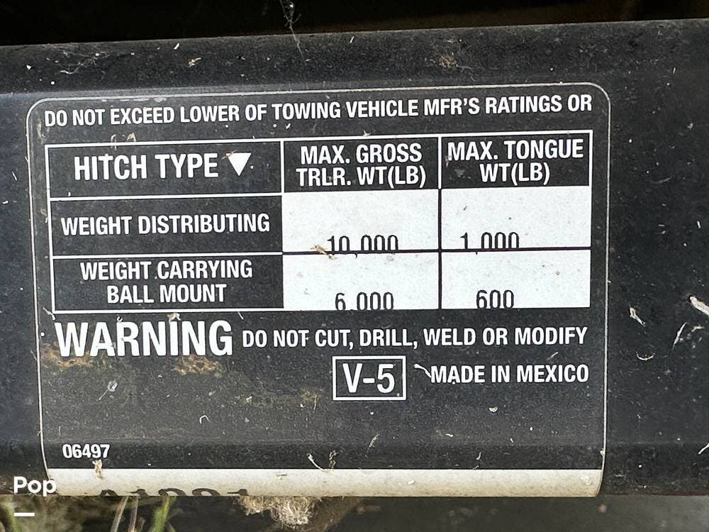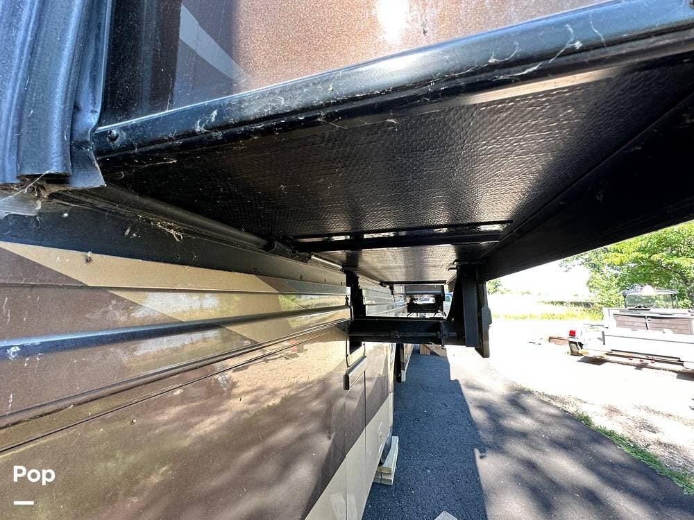 The exterior features include full body paint, double-pane tinted windows, two 13,500 btu AC units, rear and side view cameras, a 5.5kW Cummins Onan generator, a 10k tow capacity to take your vehicle or toys along, and a roof access ladder.
