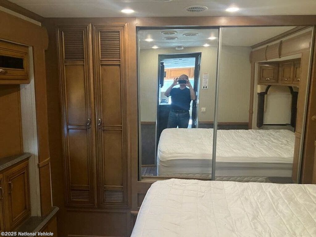 The private master suite provides a peaceful retreat with a walk-around queen bed, generous wardrobe storage, overhead cabinets, and a dedicated TV. The adjoining bathroom features a large shower, vanity, and ample storage, delivering the convenience and comfort of home no matter where your travels take you.