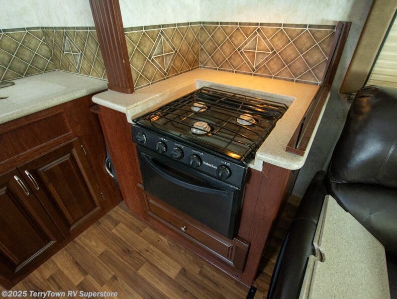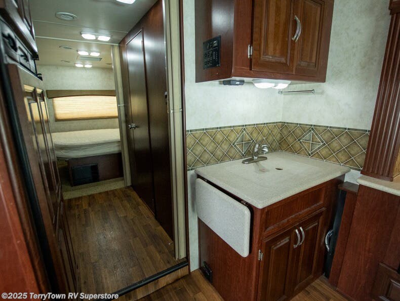Step inside 32P about mid-coach to find a refrigerator to your left, and the rest of the kitchen amenities straight ahead. There is a double sink and counter extension along the interior wall, plus a roadside slide out. The slide includes a three burner range, microwave, and overhead cabinets, plus a sofa. On the opposite side you can dine or relax at the booth dinette.