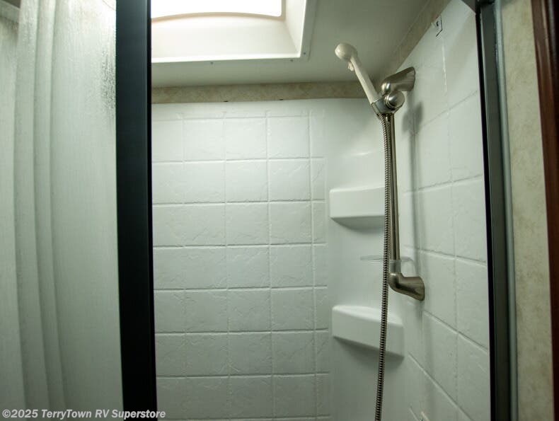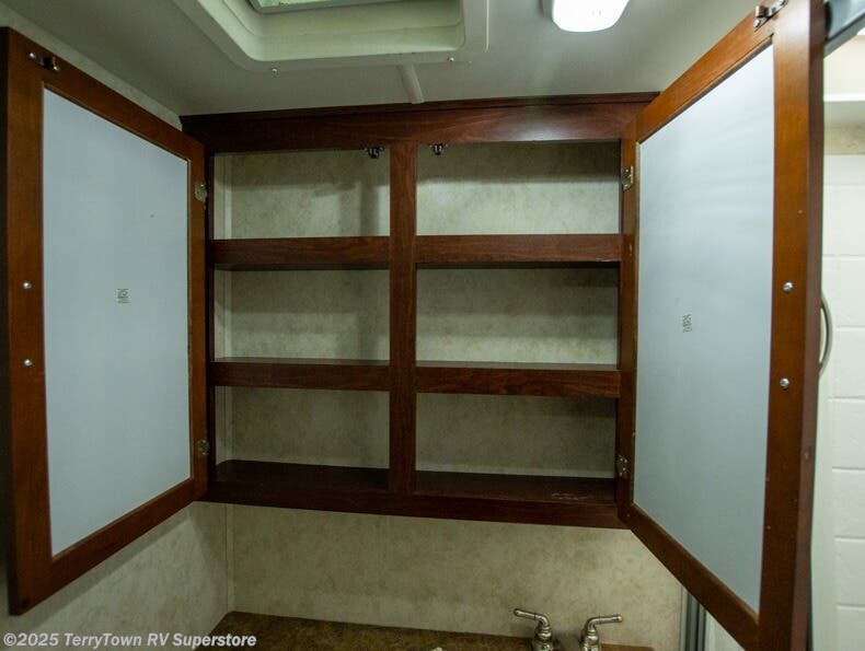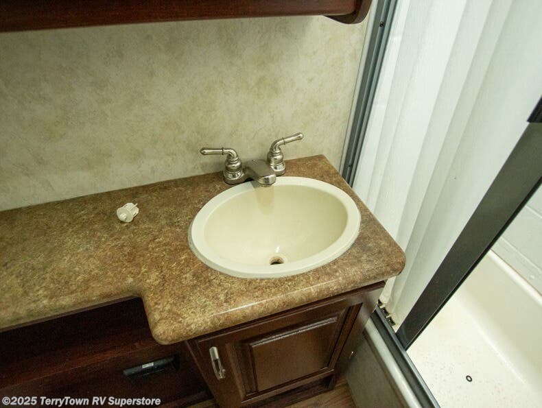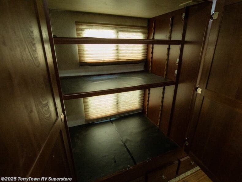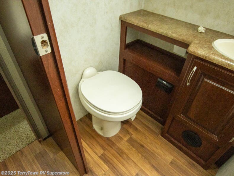 Head towards the rear to find a curbside slide out with a set of bunk beds, and the bedroom wardrobe with an optional LED TV. You may choose an optional wardrobe in place of the bunks if you like. Across from the bunks, there is a convenient full bathroom. Inside you will find a shower, vanity with sink, and a toilet. Continue back to find a queen size bed with nightstands, wardrobes, and overhead storage.