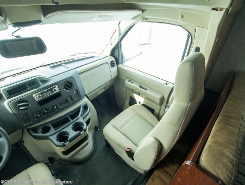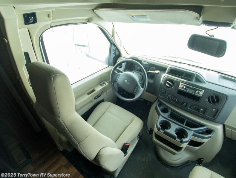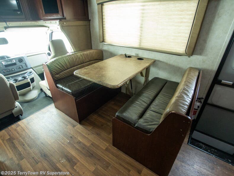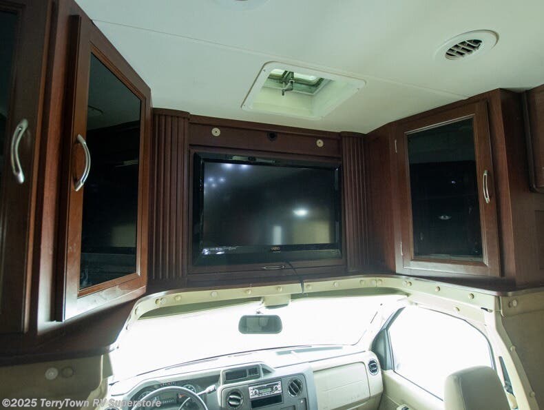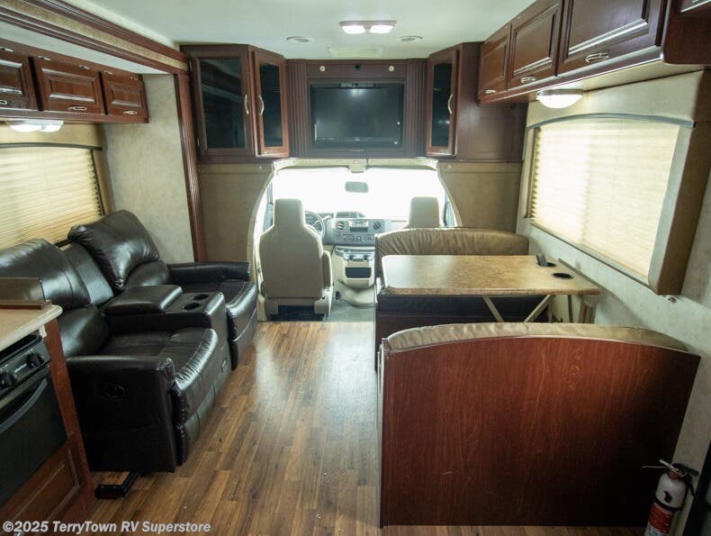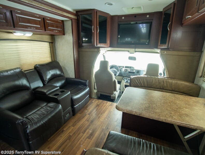 The front cab area includes a cab over bunk with an LED TV for extra sleeping space and inside entertainment. The sofa and dinette mentioned above also provide extra sleeping space if needed.