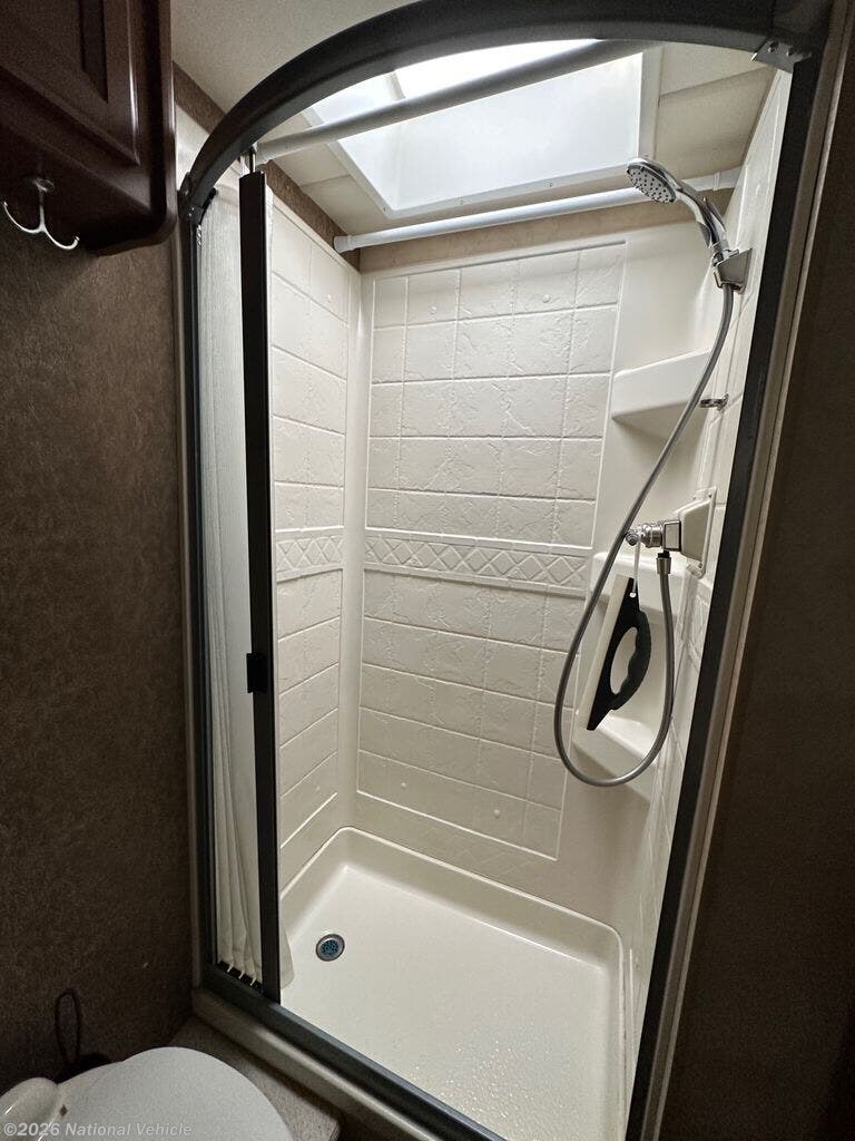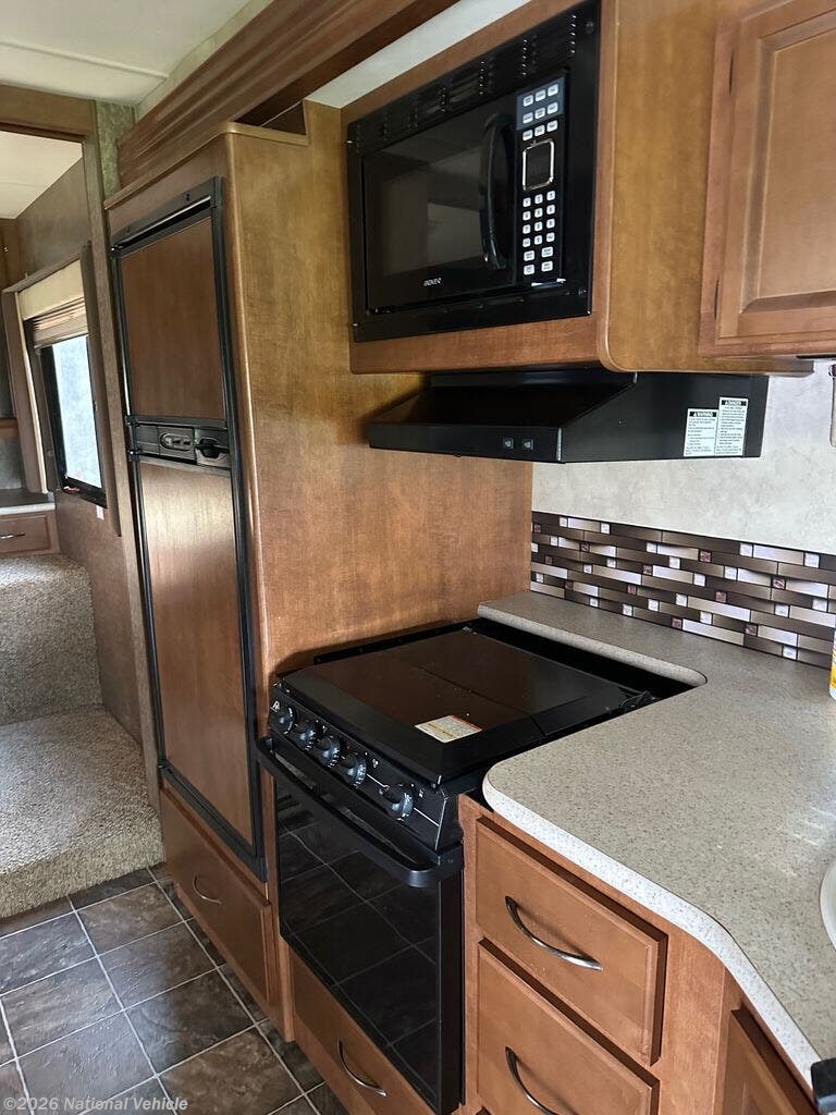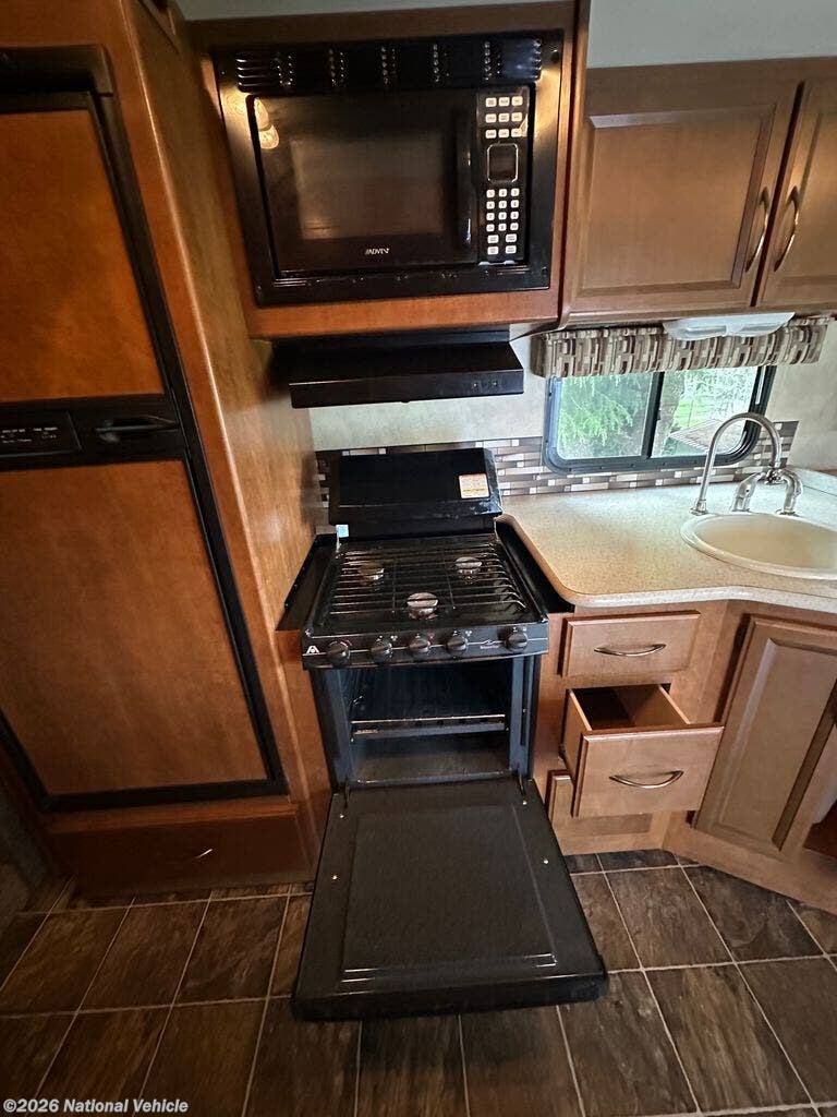 Step inside to discover a beautifully appointed interior featuring premium finishes, spacious seating, and a thoughtfully designed floorplan that maximizes both living and storage space. The inviting living area offers plush seating and an entertainment center, perfect for relaxing after a day of adventure. The fully equipped kitchen boasts solid-surface countertops, ample cabinetry, a refrigerator, microwave, and stove?ideal for preparing meals on the go.